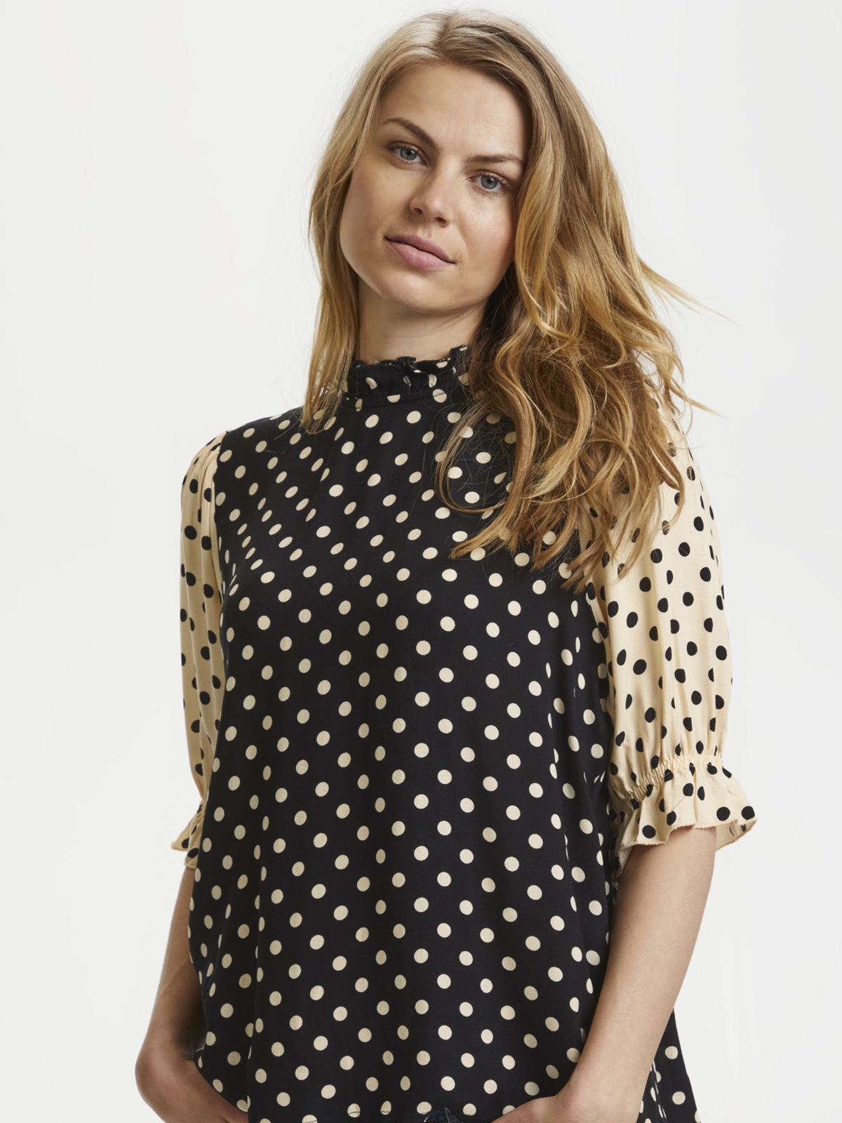 Flot prikket Dotta bluse fra Culture med korte ærmer.Blusen har en lille flæse krave ved halsen og ved ærmerne.