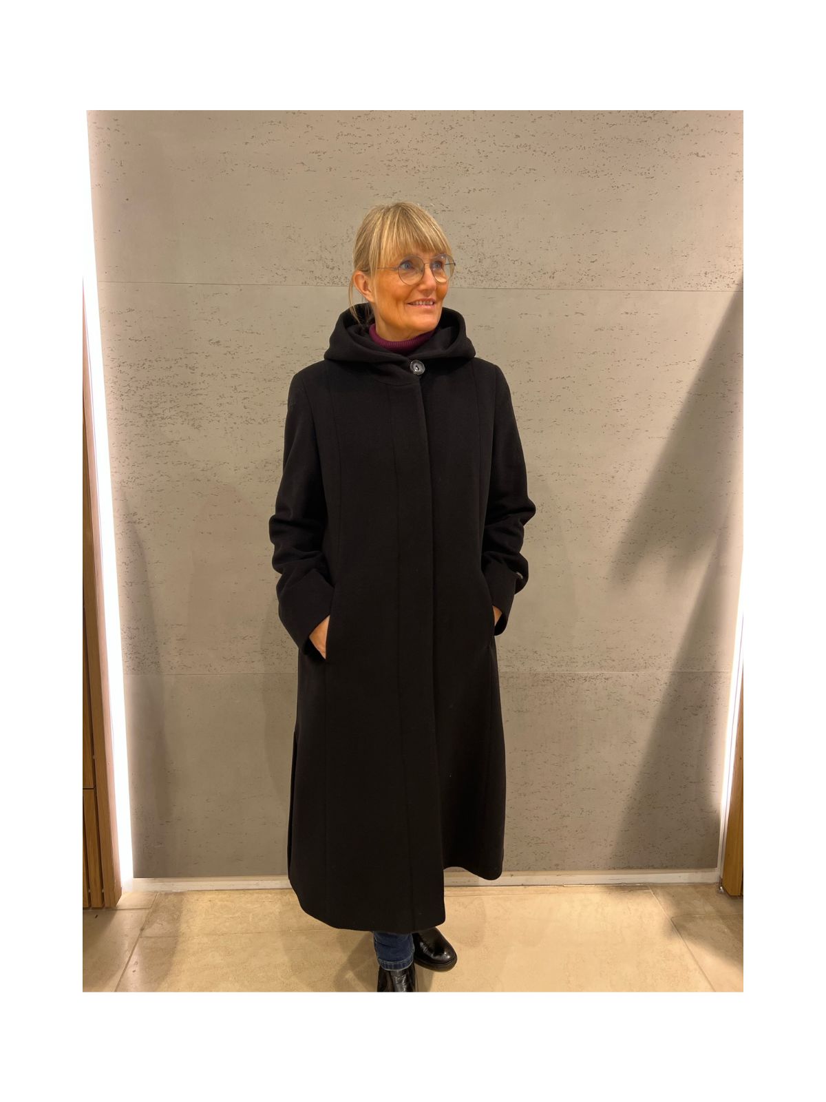 Klassisk eksklusiv lang ulden frakke fra HETTEMARKS i fantastisk uld og cashmere kvalitet samt i flot slank taljeret design. Frakken har en høj krave og hætte samt skjult knap lukning og en synlig knap i halsen samt ekstra vindfang og god gå-slids, i siderne, dette giver frakken ekstra elegance. Frakken er thermo foret og dermed også meget vindafvisende i super komfortabel designSæson: Vinter
