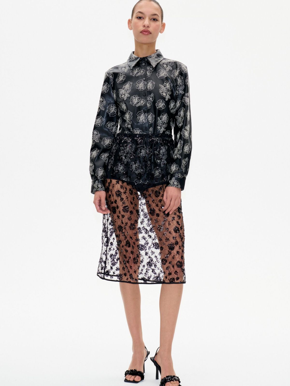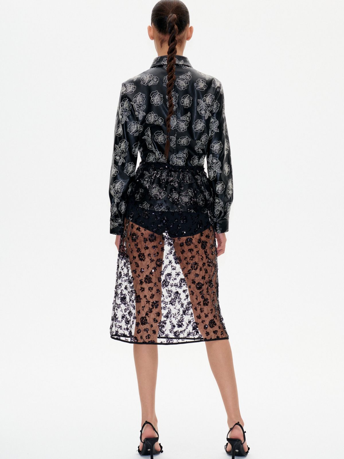Feminin midinederdel med høj talje fra Baum und Pferdgarten. Nederdelen er designet i transparent materiale og har små pailletdetaljer over det hele. Modellen er 178 cm høj og har størrelse 36 på.Materiale: 100% Polyester