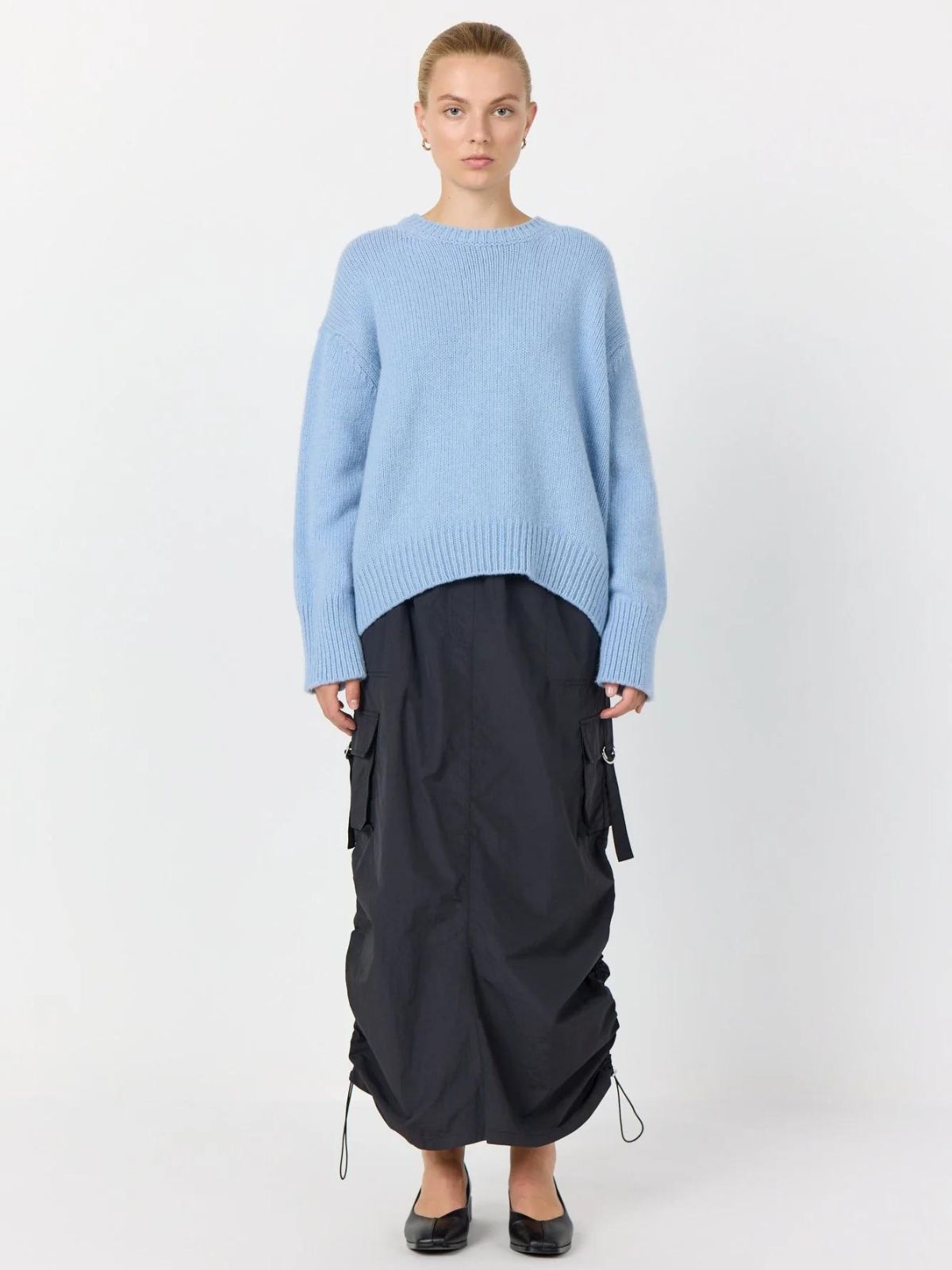 Flot strik i en dejlig blød kvalitet fra Leveté Room. Strikken har et oversize fit, rund halsudskæring og ribkanter ved hals, ærmer og i bunden af blusen.Materiale: 90% Merinould, 10% Cashmere