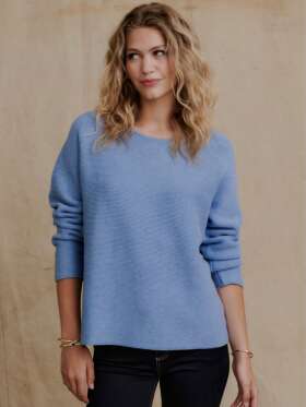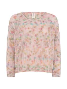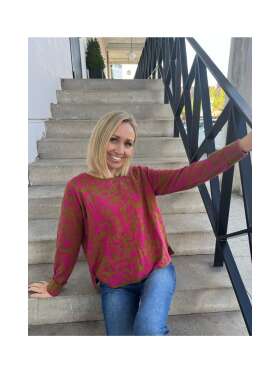 Sofistikeret strik fra MICHA med transparente ballon ærmer med flora print samt bred manchet med knapper. Strikken har en semihøj halskant med flæse effekt.Længde: ca. 62 cm