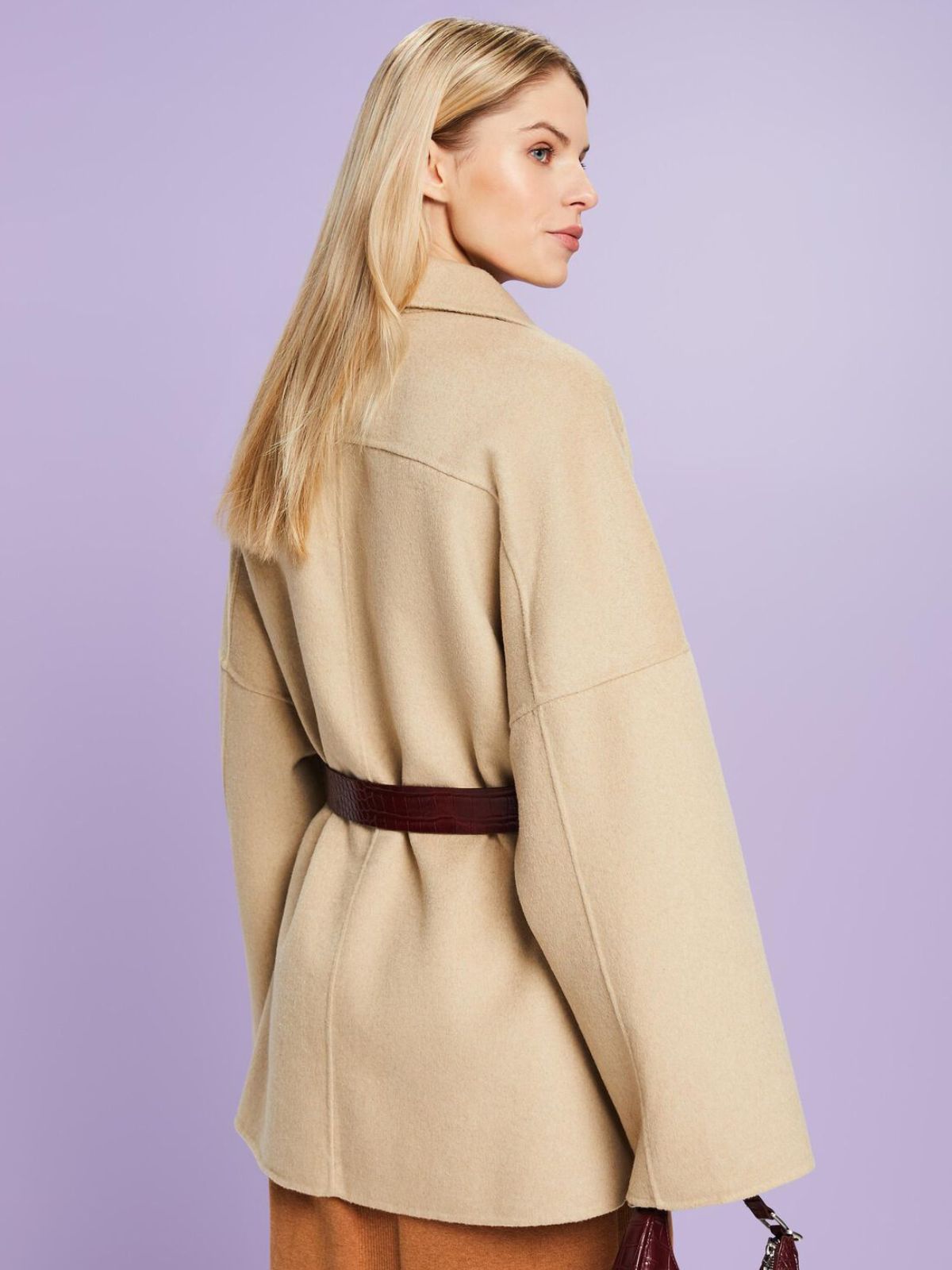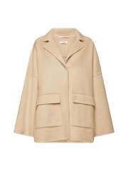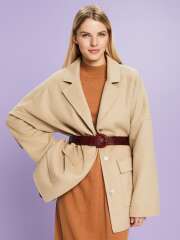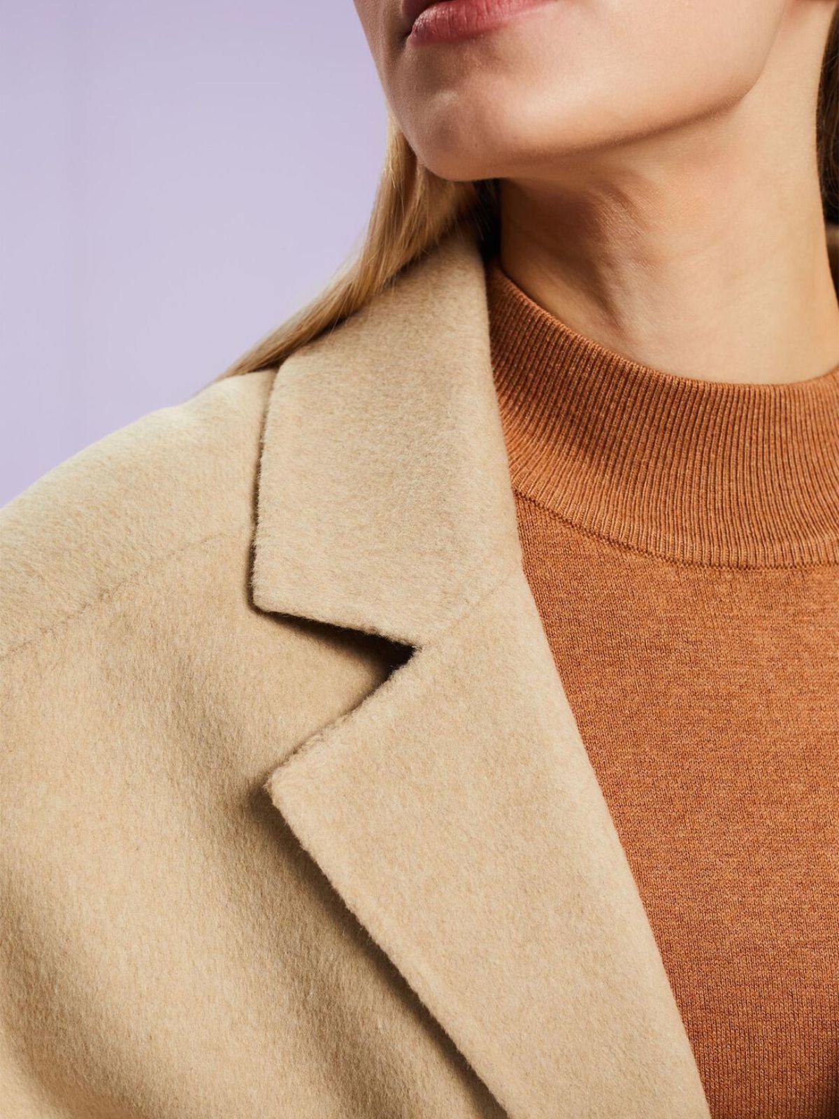 Feminin frakke fra Esprit. Frakken har en løs pasform, revers med indhak, lange ærmer og super blødt materiale. Modellen er 177 cm høj og har en størrelse S på.Materiale: 53% Polyester, 44% Genanvendt uld, 3% Andre fibre