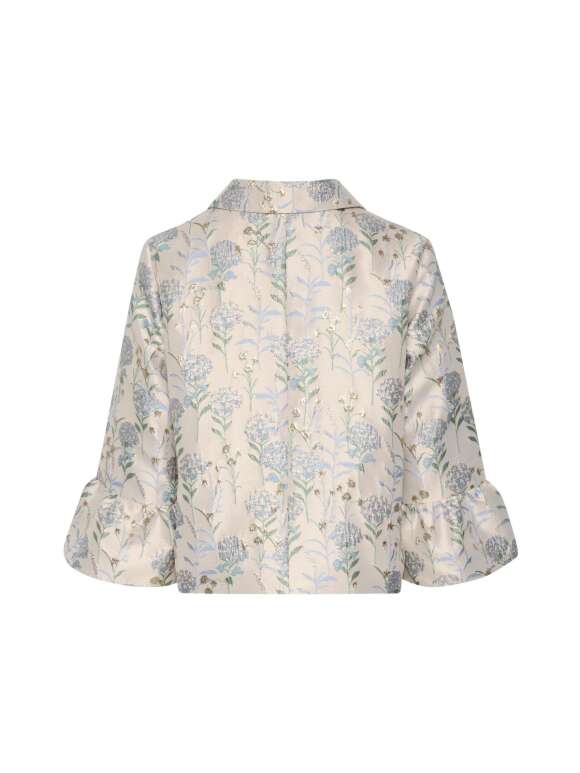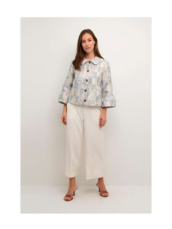 Feminin jakke fra Culture. Jakken har et smukt vævet materiale, 3/4 lange ærmer med vidde i enden, knaplukning langs fronten og en krave.Materiale: 60% Polyester, 30%Nylon, 10% Metallisk garn