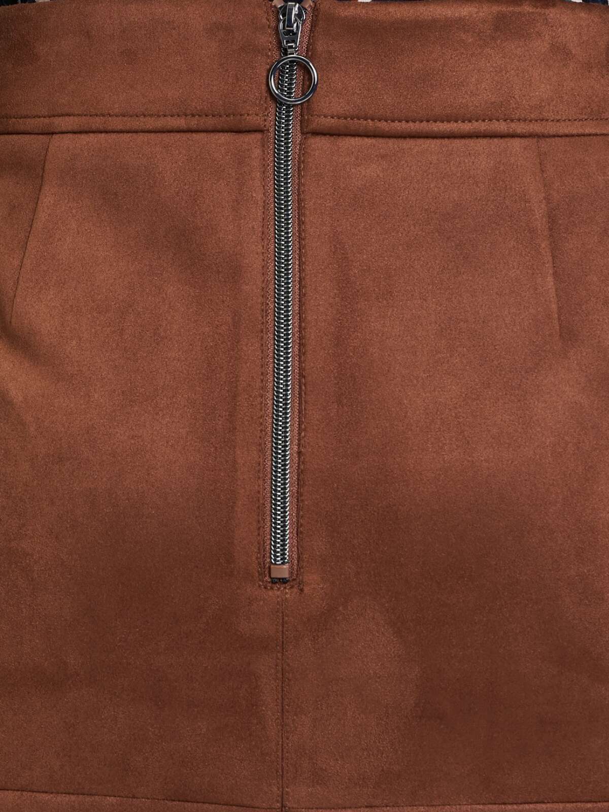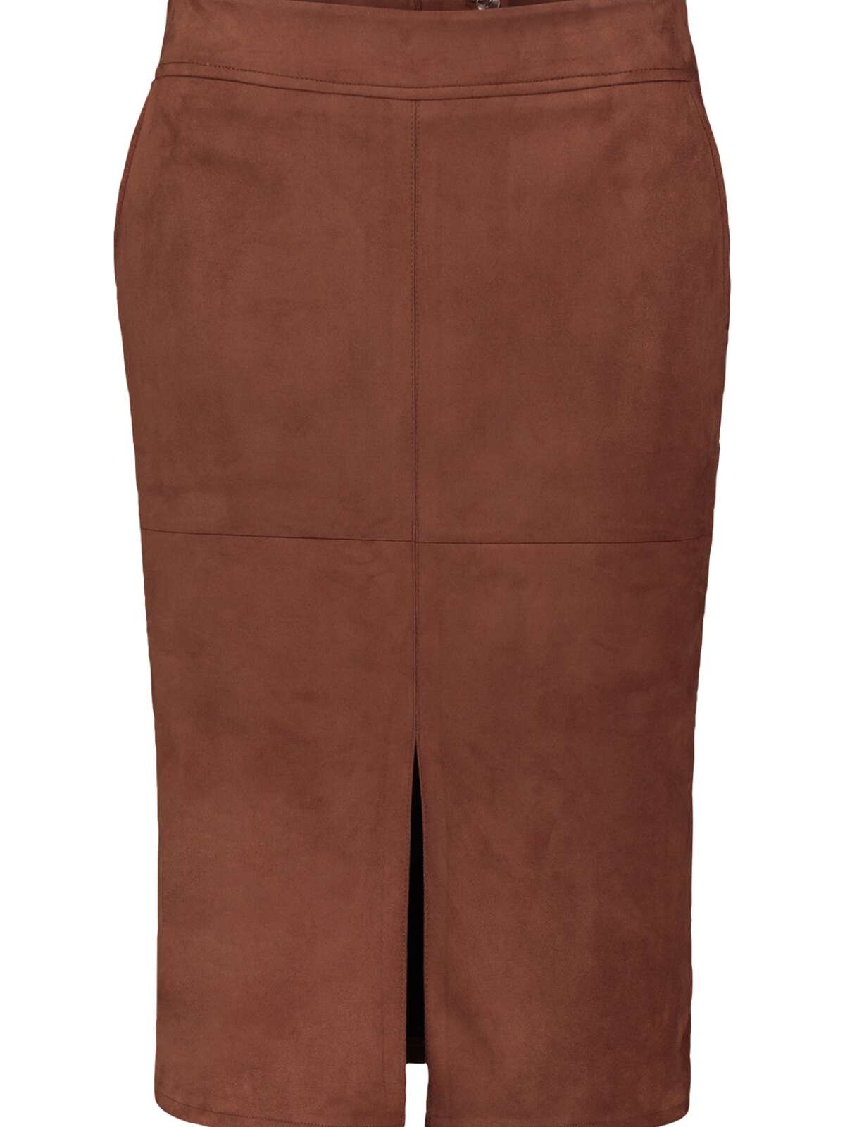 Raffineret nederdel fra Betty Barclay i imiteret ruskinds look. Nederdelen er i figur betonende pencil design med høj slids foran samt lynlås lukning bagtil.Længde: ca. 70 cm