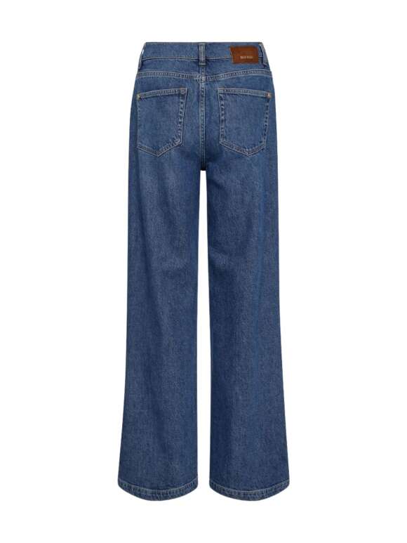 Bredde bukser fra Mos Mosh i en blå vask. Buksen har tre forlommer og to baglommer.Farver: 401 Blue