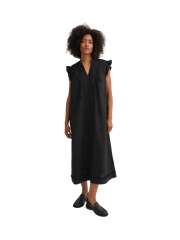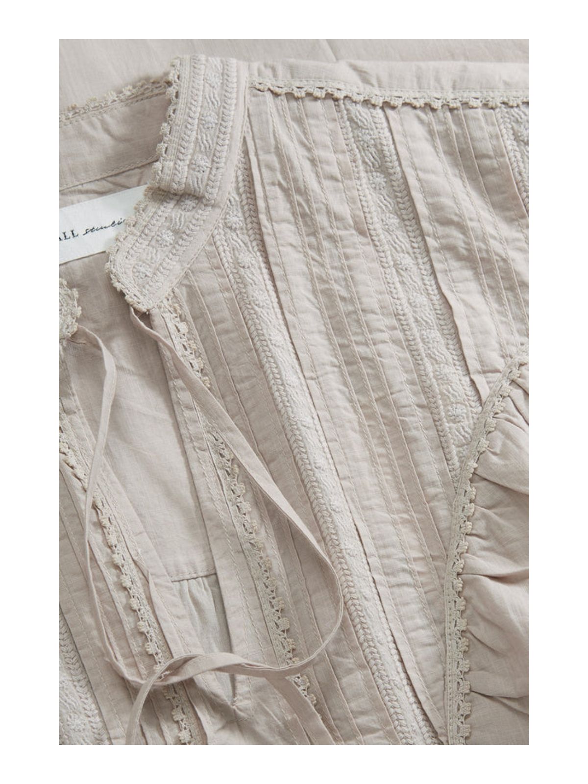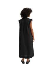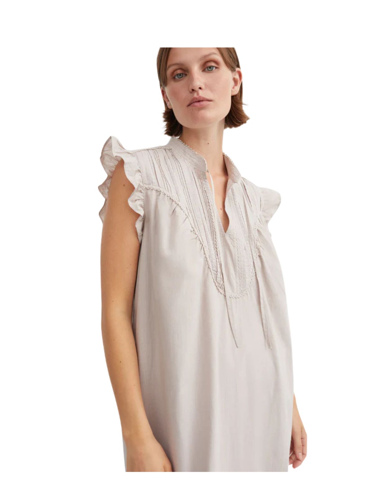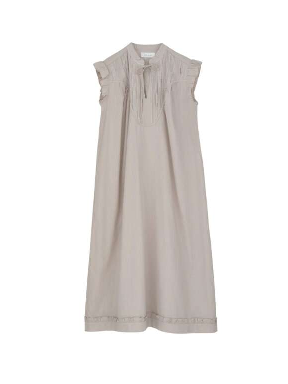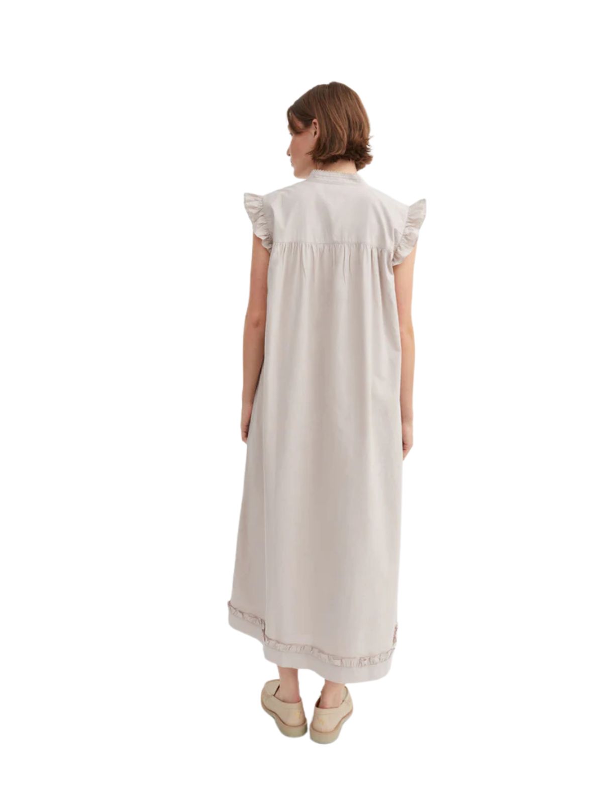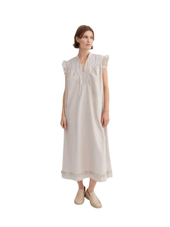 Aurora Dress fra SKALL i lang løst design fremstillet i blød, økologisk bomuld. Kjolen har en klassisk silhuet med en afslappet pasform, fine flæsedetaljer ved ærmerne, ståkrave med bindebånd og blondedetaljer, der giver et fint feminint udtryk.Kjolen er designet med en løs, oversized pasform. Hvis du foretrækker en mere skræddersyet silhuet, anbefaler vi at gå en størrelse ned.