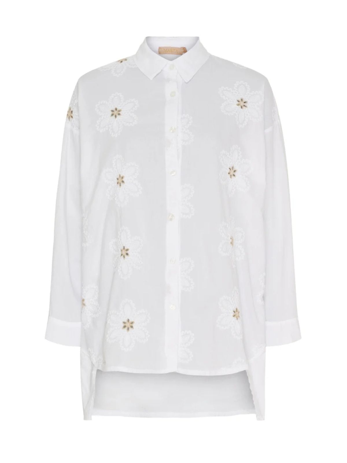 Edgar Shirt fra SKALL i oversize herreinspireret skjorte i økologisk bomuldspoplin. Skjorten har en almindelig krave, lange ærmer med knaplukning på manchetterne og lukkes med knapper hele vejen ned. Derudover har den en brystlomme og en bred læg i ryggen.