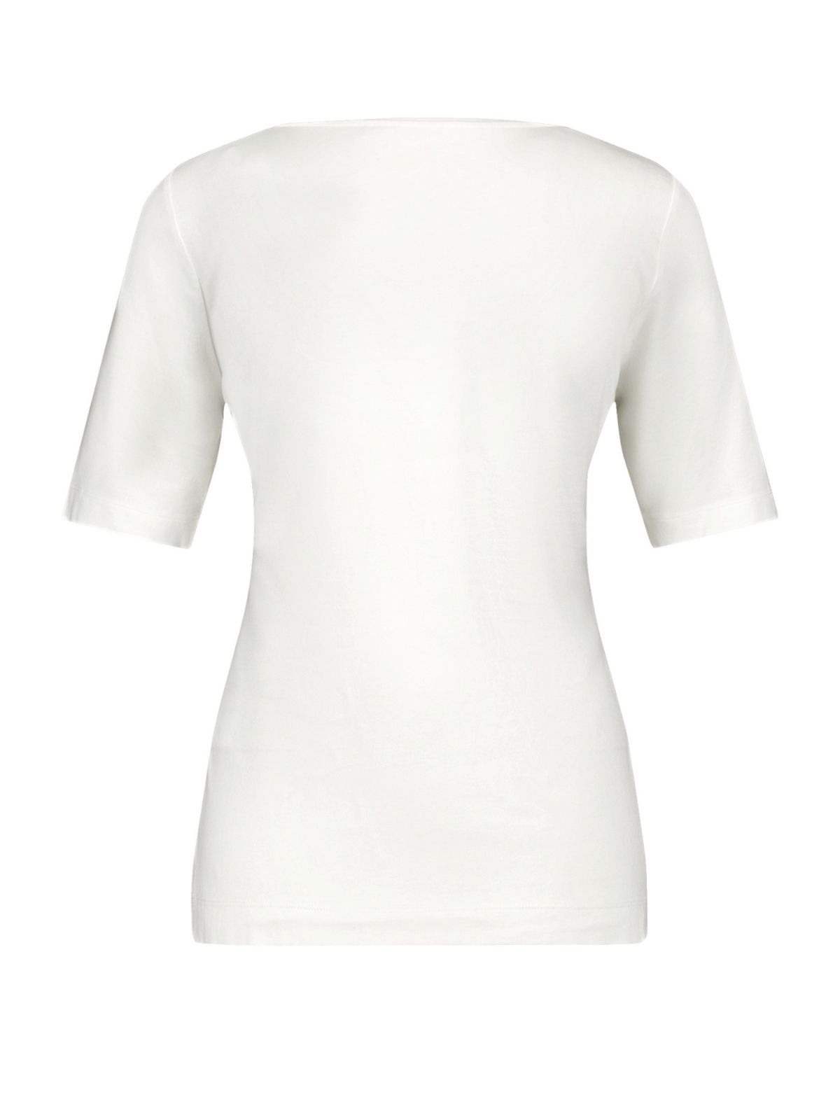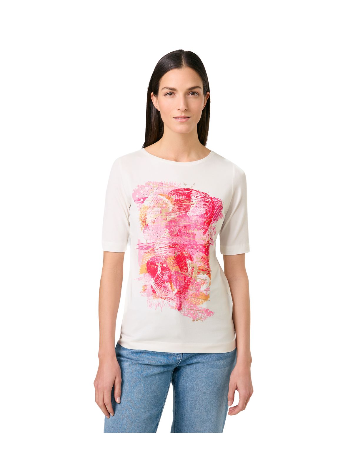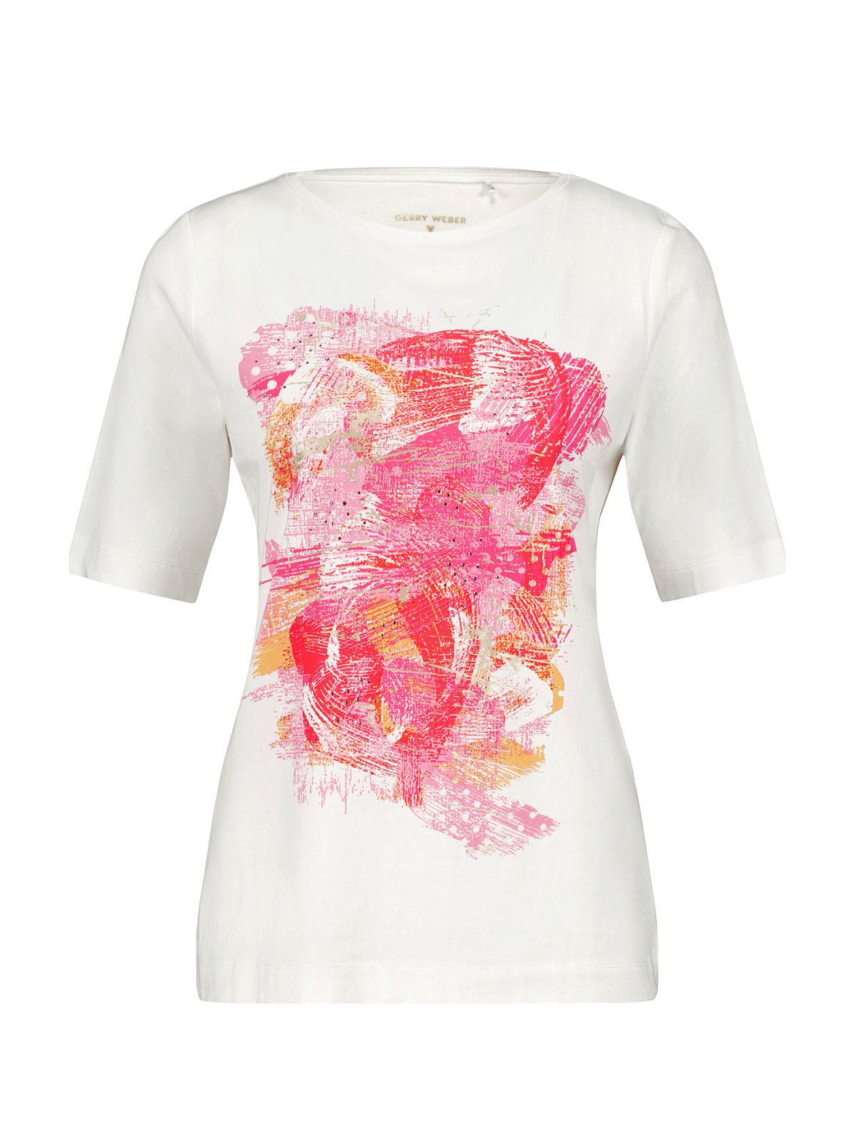 Sporty bluse fra GERRY WEBER med farverigt art print med dekorative similisten på fronten. Blusen har en rundet hals, korte ærmer samt ensfarvet ryg.Længde: ca. 64 cm