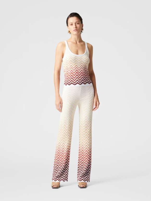 Eksklusive Missoni bukser. Bukserne har elastik i taljen, og i flare. Buksen har et fint zig zag mønster som kendetegner Missoni. Buksen er let og falder flot langs benene. Elegant og ekslusiv buks som kan bruges til hverdag eller styles til særlige begivenheder,