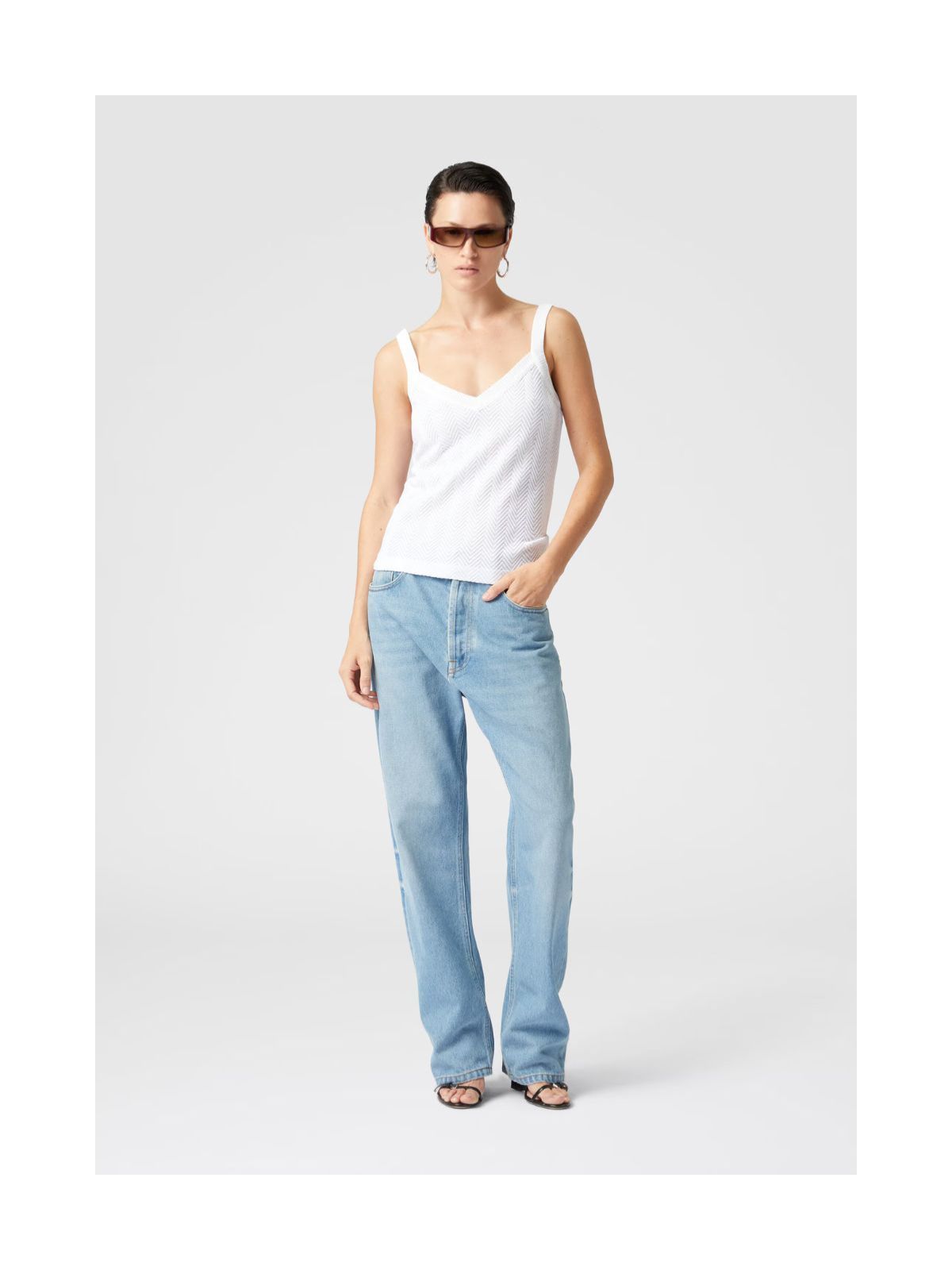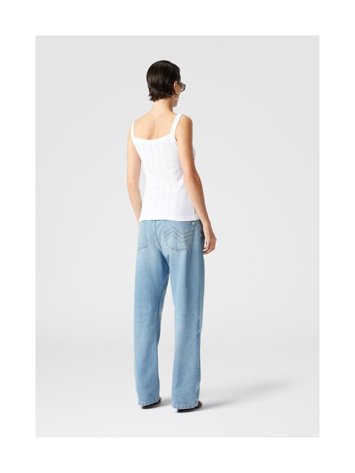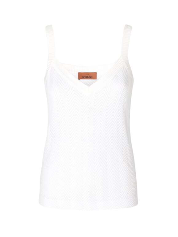 Elegant tanktop med et raffineret tone-i-tone zigzagmønster, der vidner om udsøgt håndværk og sans for detaljen. Den lette blanding af bomuld og viskose giver en luftig fornemmelse og smelter smukt sammen med stoffets sofistikerede farvespil. Et stilrent design, der udstråler diskret luksus og den underspillede elegance, som kendetegner maisonens univers.