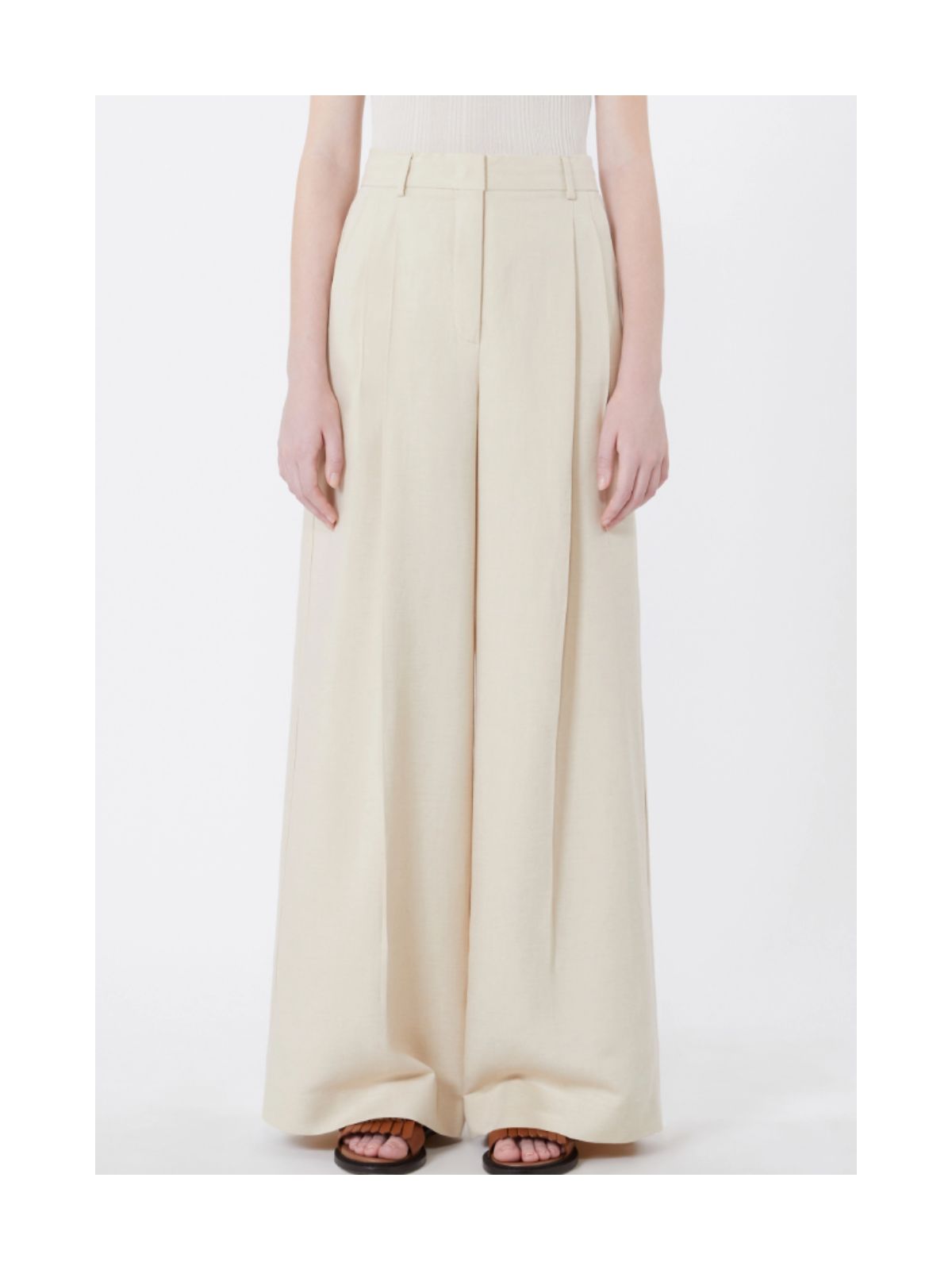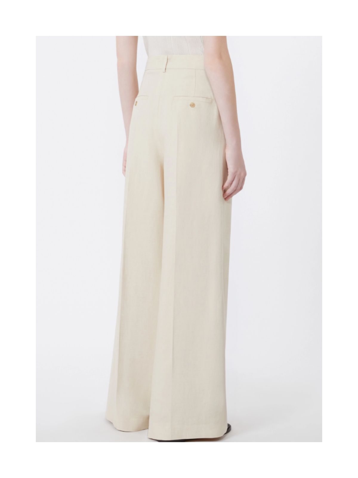 Raffineret wide legs buks fra MAX MARA i en komfortabel viskose/hør kvalitet. Buksen har høj talje, bæltestropper, dobbelte læg foran, skrålommer samt pressefold og elegant flatterende bredde.Indvendig Benlængde: ca. 84 cm