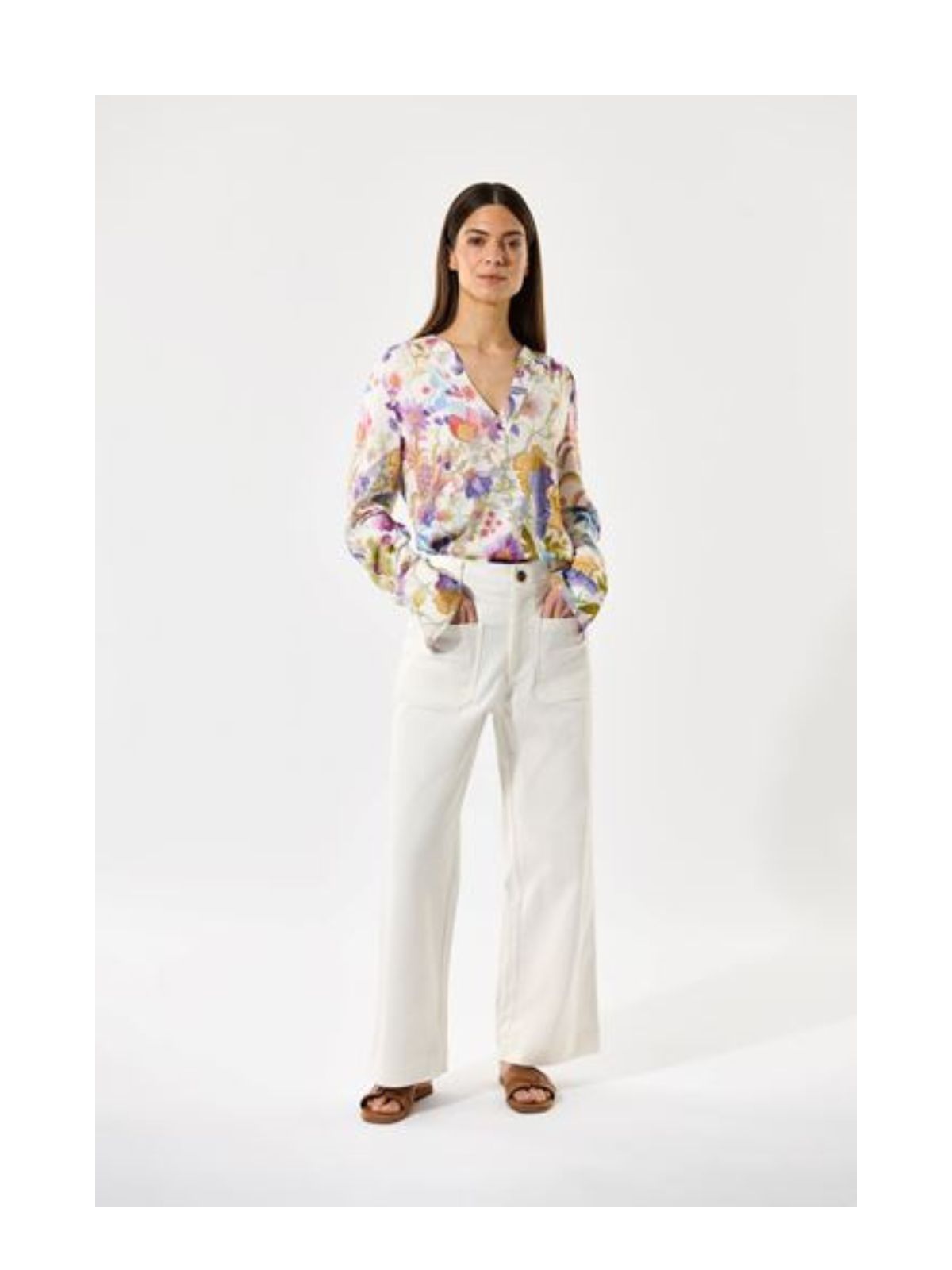 Smuk bluse med mønster. Blusen har lange ærmer, v-hals og knappedetaljer.