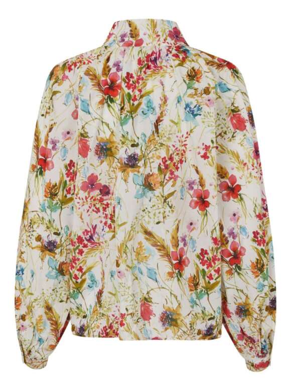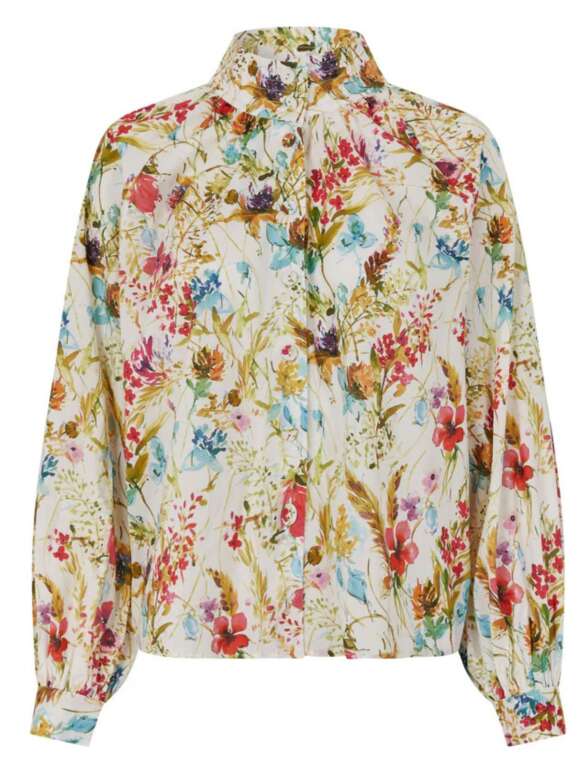 Sofistikeret hør bluse fra DEA KUDIBAL med farverigt flora print. Raglanærmerne og skuldrene på denne feminine, løstsiddende bluse giver delikate og charmerende detaljer. Blusen har en høj halskrave og med knapper ned langs fronten giver en elegant afslutning.Længde: ca. 65 cm