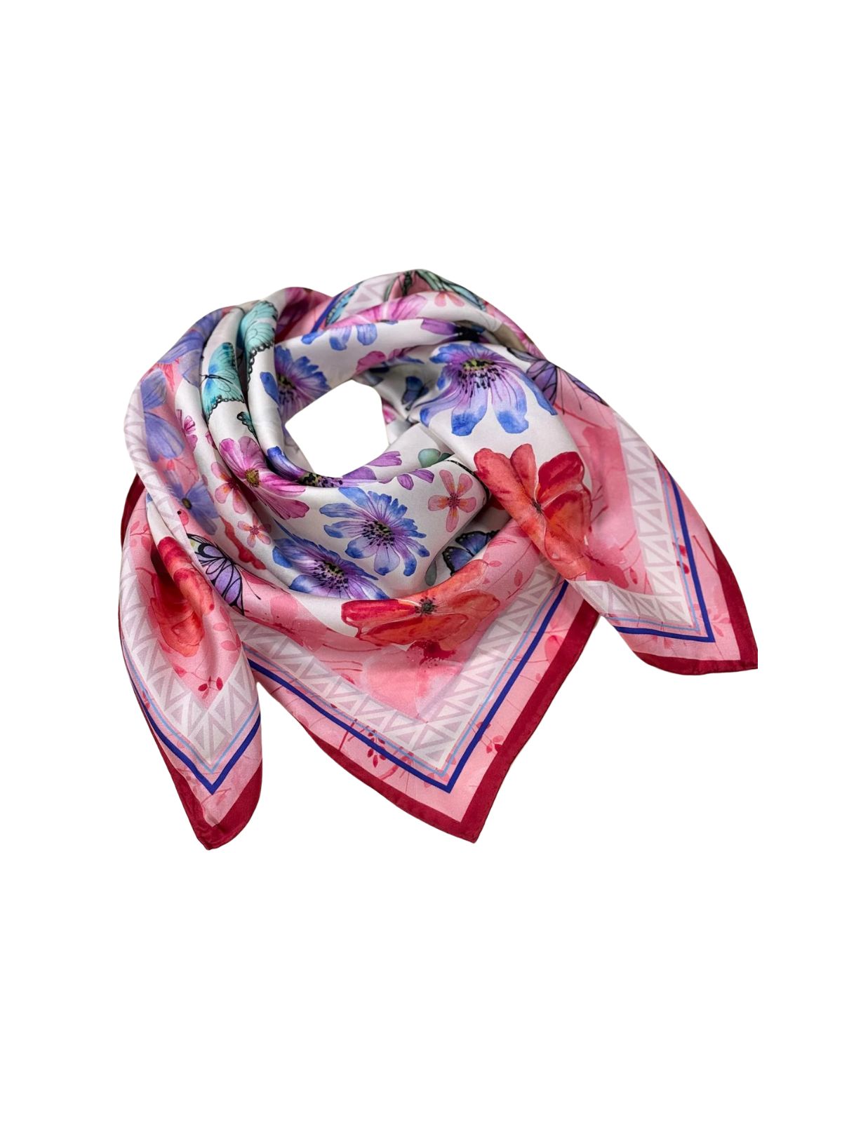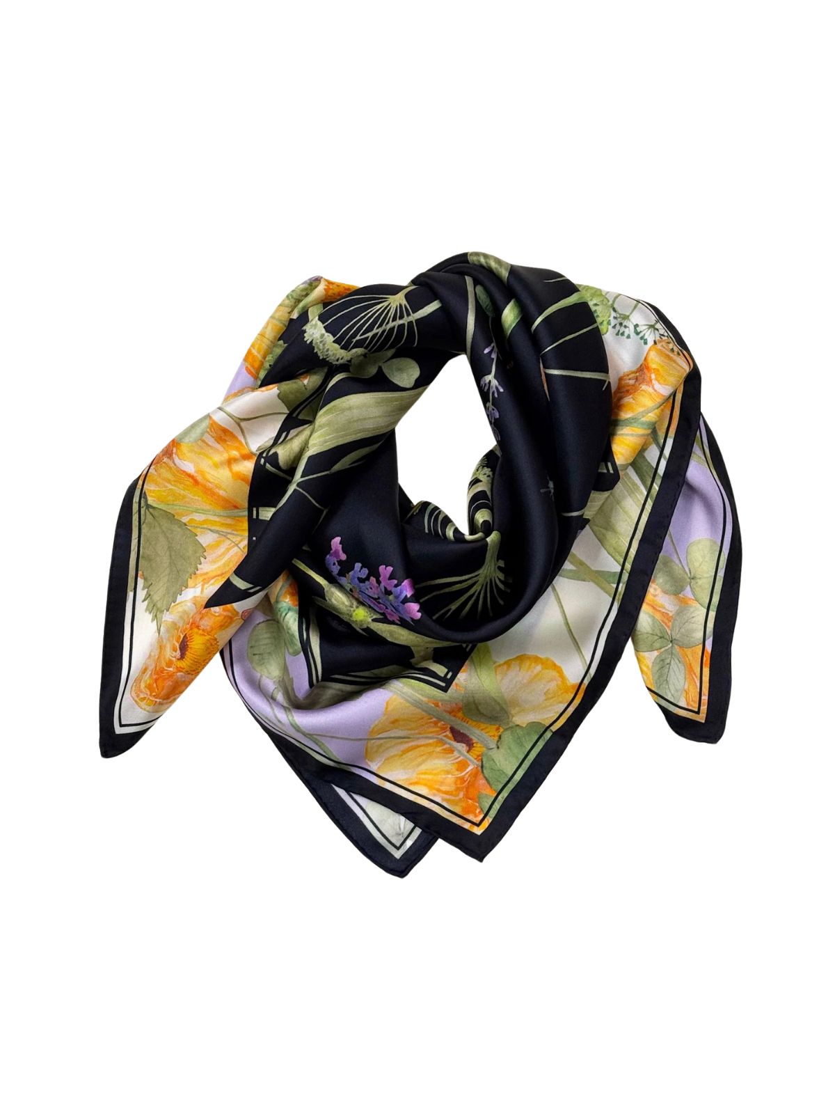 Elegant og farverigt silke tørklæde fra ALL BY VOSS med håndsyede rullekanter.Style det med florlette toppe i de varme sommermåneder og sæt det i halsen på en kraftig strik i efteråret sammen med mere brændte nuancer og mørkere beklædning.