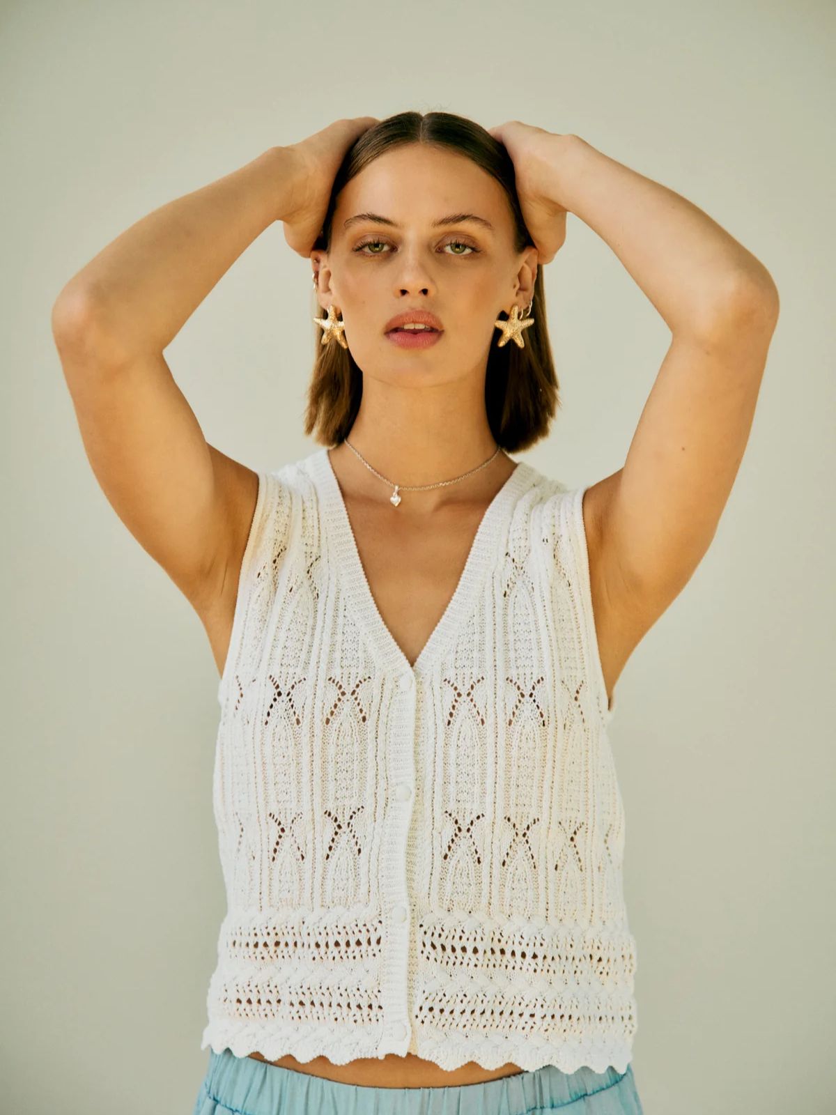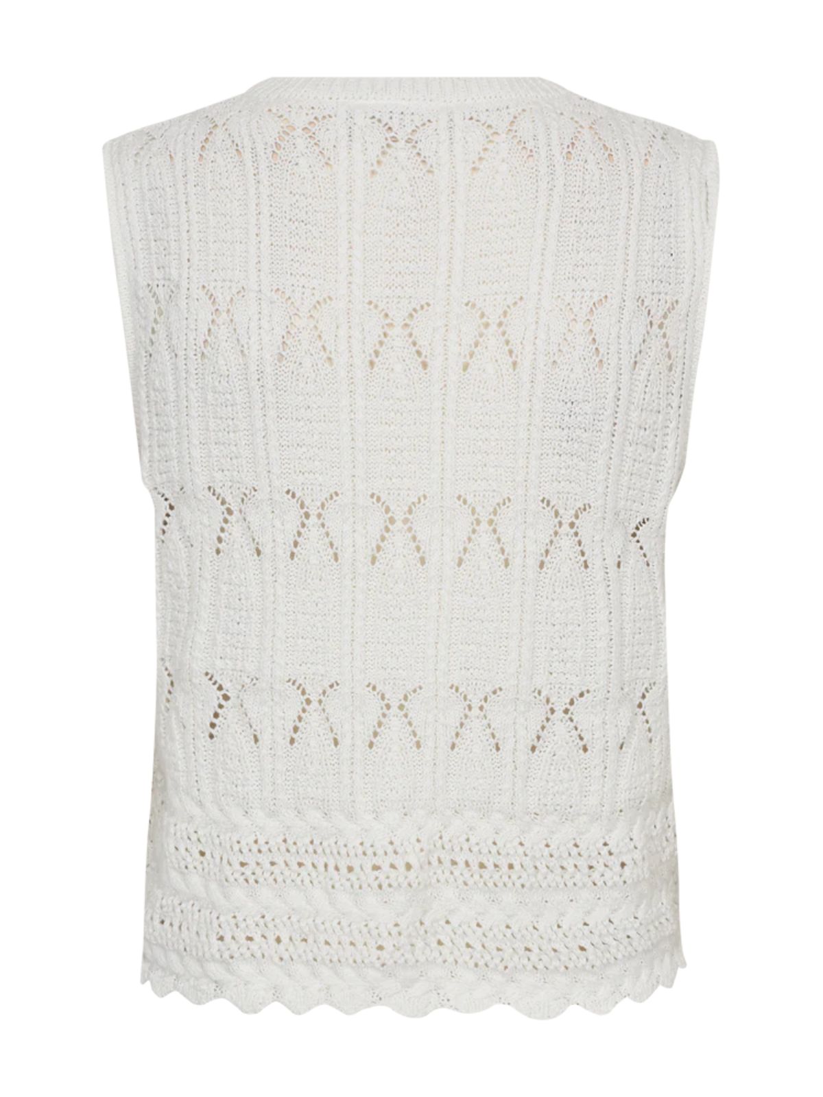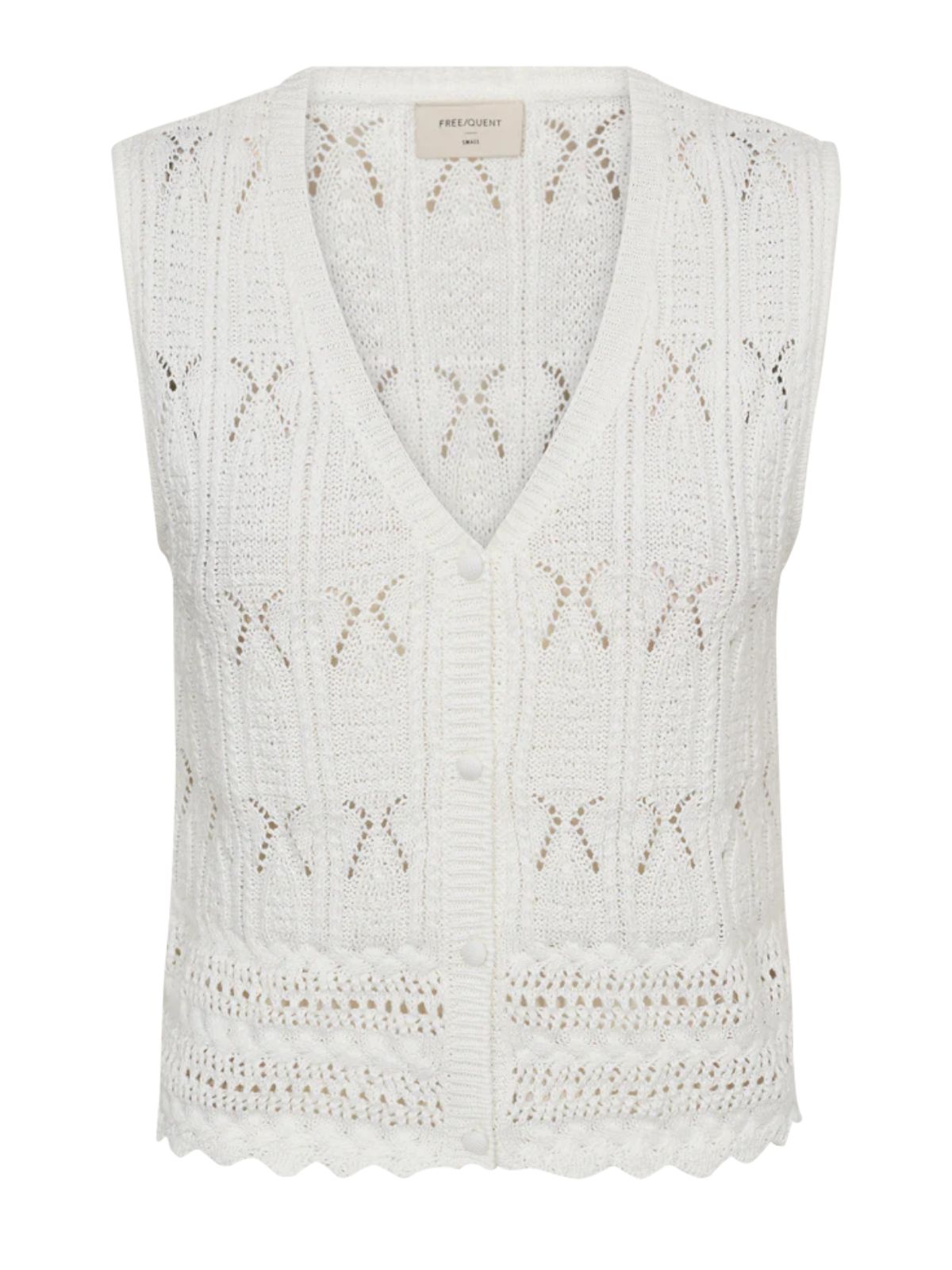 Feminin strik vest fra FREEQUENT med fint broderi anglaise hulmønster og en regulær pasform. Strik vesten har en dyb V-udskæring samt knaplukning ned foran.Længde: ca. 60 cm