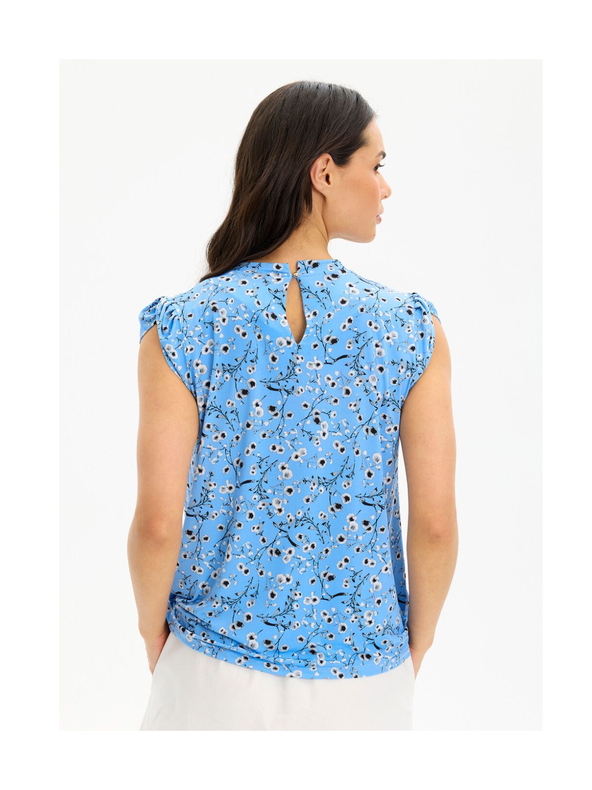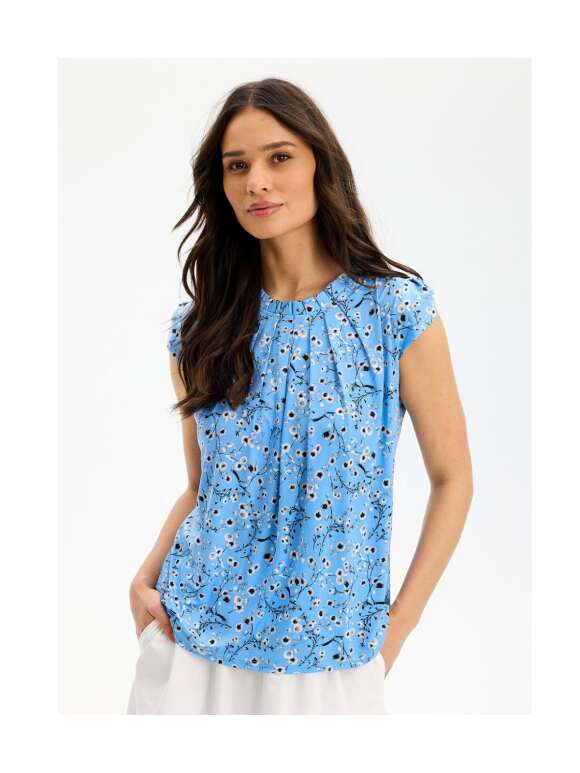 Let og feminin bluse i klar blå med blomsterprint. De små læg ved halsen og de korte ærmer skaber et elegant fald og en flatterende silhuet.