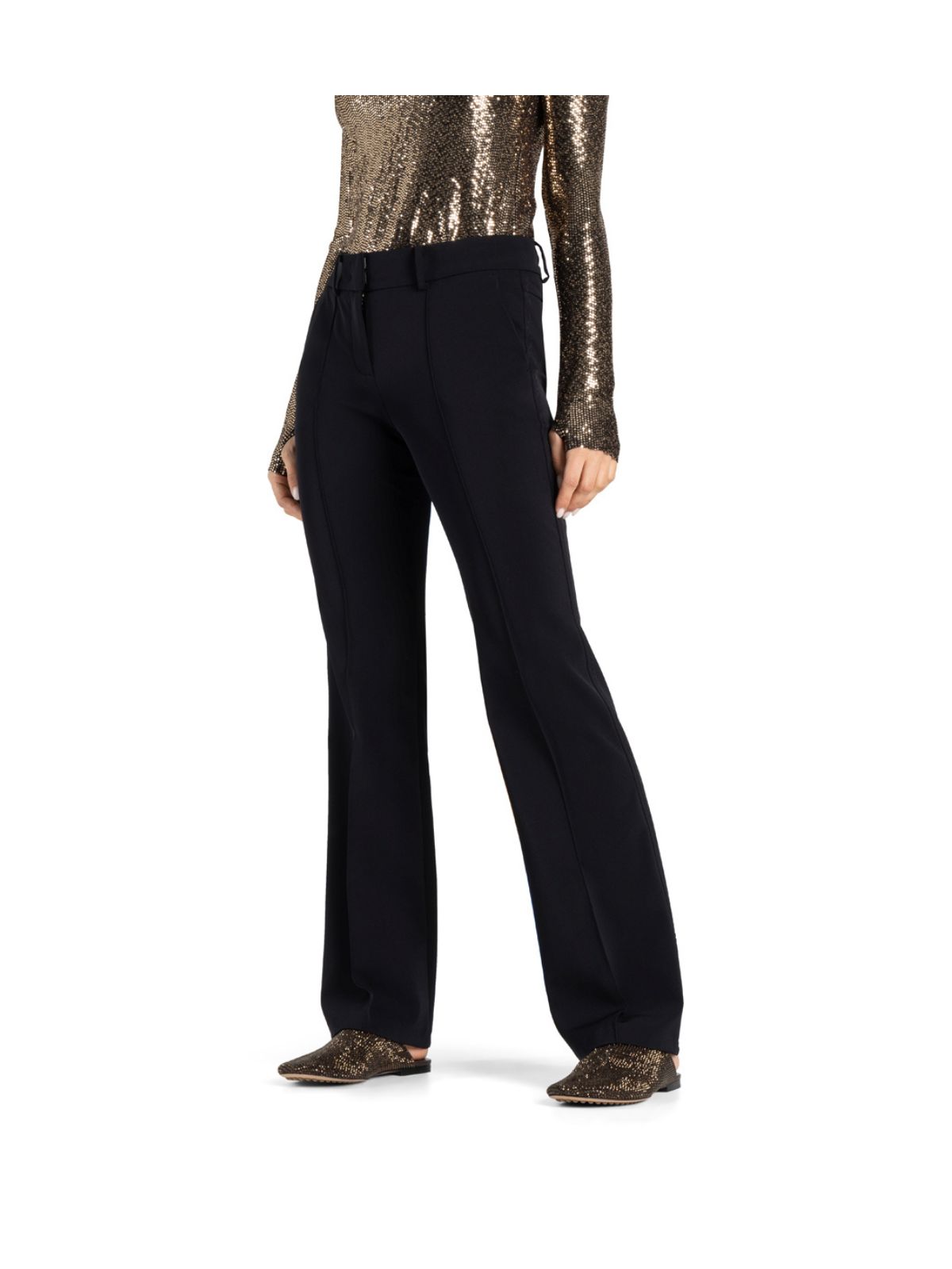 Farah bukser fra Cambio i et elastisk stretch stof med almindelig talje og flared ben. De lukkes med lynlås og hægte og har syede stikninger ned langs benene samt sidelommer.Materiale: 88% Polyamid, 12% Elastan