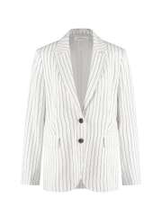Elegant, figursyet blazer med fine nålestriber og bæredygtige materialer. De formgivende indsnit og delingssøm bagpå fremhæver figuren, mens klassiske klaplommer tilføjer et stilfuldt touch. Behagelig at have på – perfekt til både business-look og pæne anledninger. Kan matches med bukser i samme kvalitet eller styles mere afslappet med jeans.Style: 530034 31239