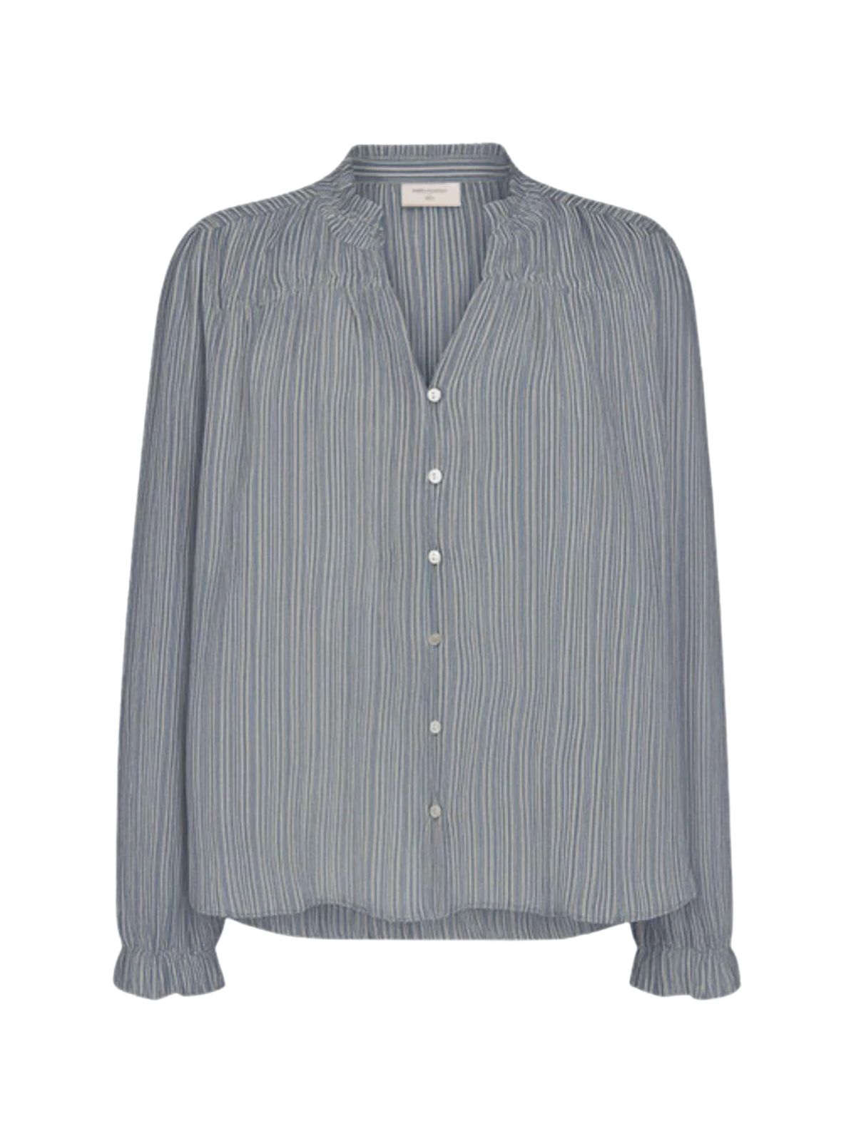 Bluse med v-hals og smockdetalje samt gennemgående knapper. Lange ærmer med smal elastikkant. Meget let og behagelig kvalitet.