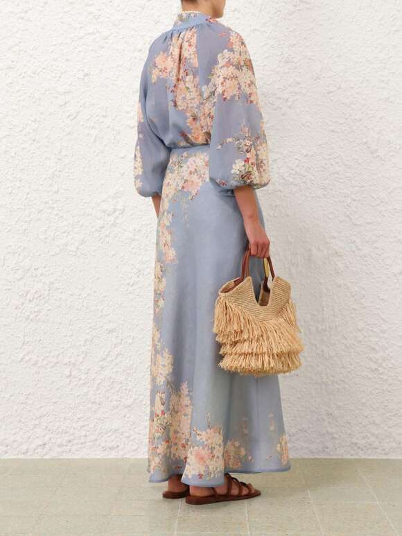 En let og luftig bluse i 100 % ramie med et botanisk blomsterprint i smukke tealblå nuancer. Designet har en opretstående krave, lange ærmer med elastiske manchetter og dekorative rouleau-løkker med hæklede knapper ned langs fronten. En bølget blondekant ved kraven tilføjer et feminint touch, mens det placerede print gør hver bluse unik.Materiale: 100 % ramie