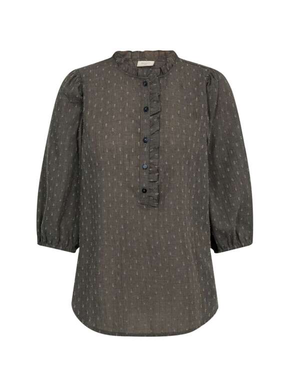 Bluse i let kvalitet med jacquardmønster og metallisk tråd, som skaber et diskret, stribet udtryk. Designet med trekvarte pufærmer med elastik ved kanten, flæsedetaljer i halsen og langs knaplukningen samt en løs og elegant pasform.