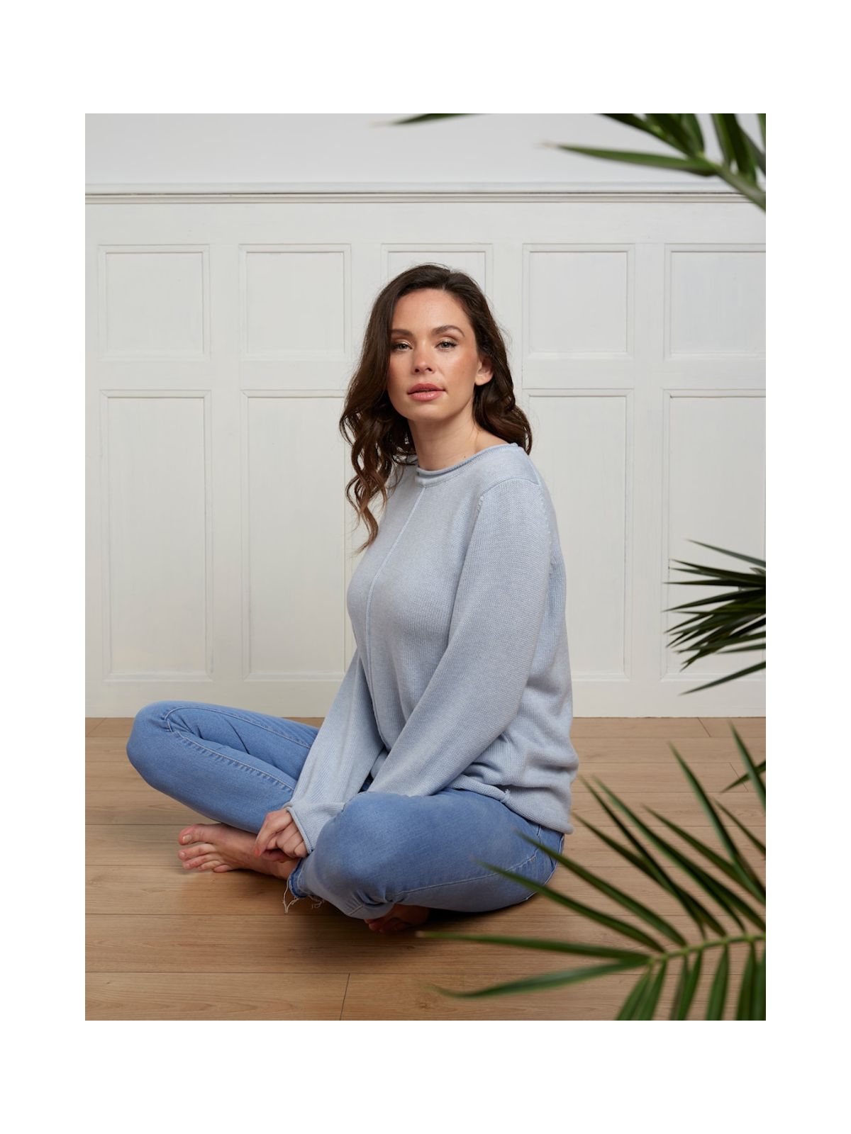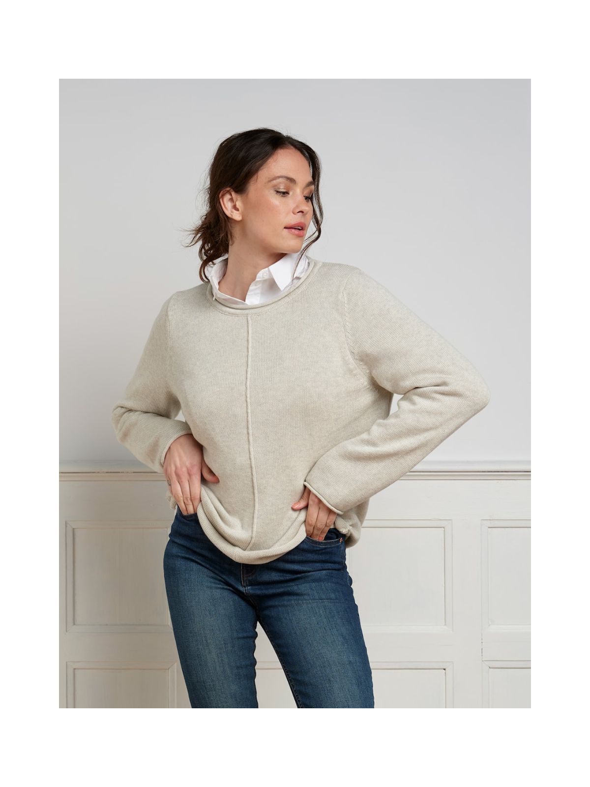 Skøn strik fra Skovhuus. Strikken har lange ærmer, rund halsudskæring og detalje langs fronten. Style den til et par jeans for et smart efterårslook.Materiale: 100% Økologisk bomuld