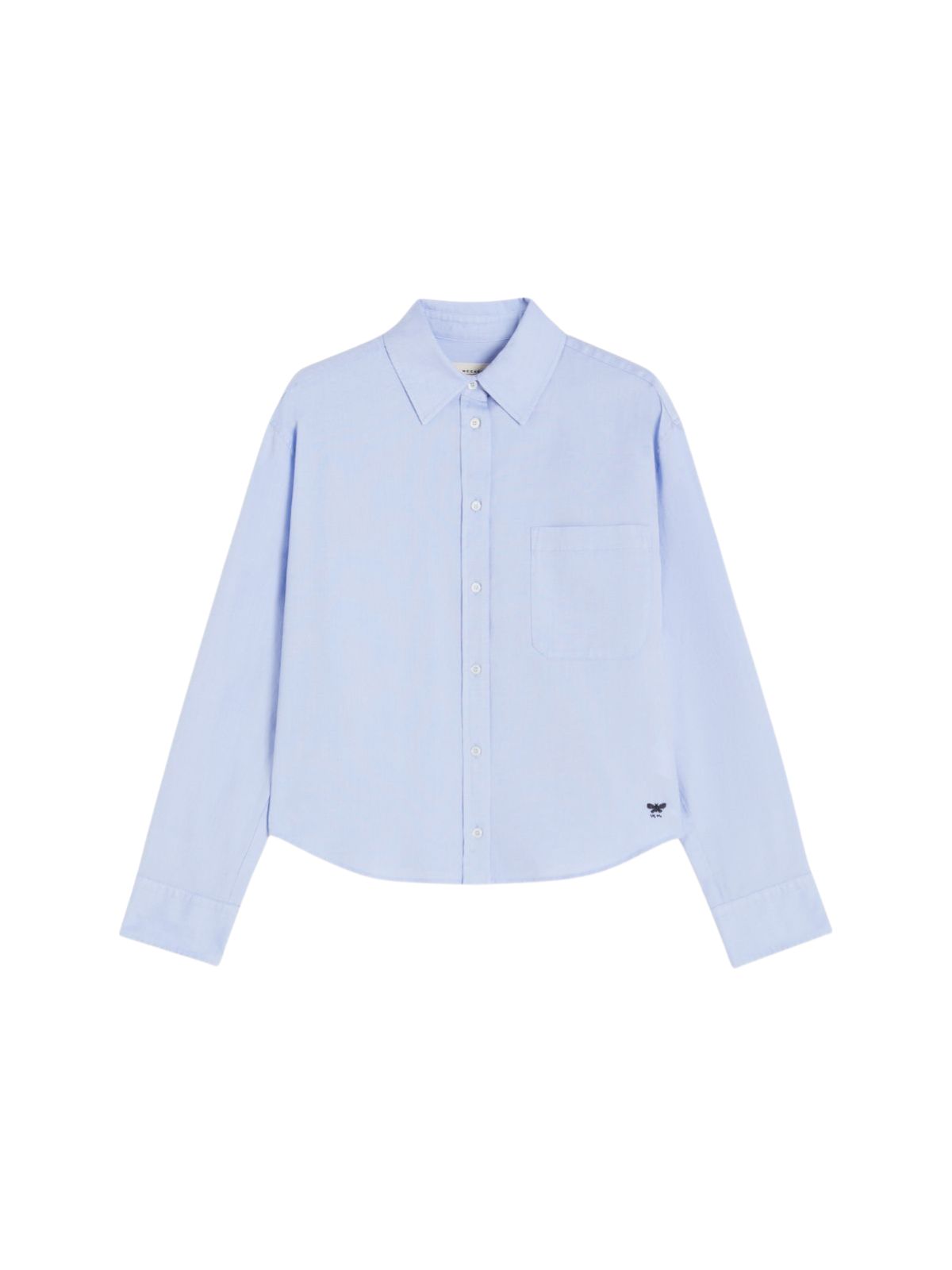 Straight-fit skjorte i ren økologisk bomuld med små detaljer som broderet sommerfuglelogo på venstre kant. Designet med indsatte ærmer, knapdetaljer ved manchetter, perlemorsknapper foran, brystlomme, plisseret rygstykke og afrundet kant for et tidløst og elegant look.Materiale: 100% Bomuld