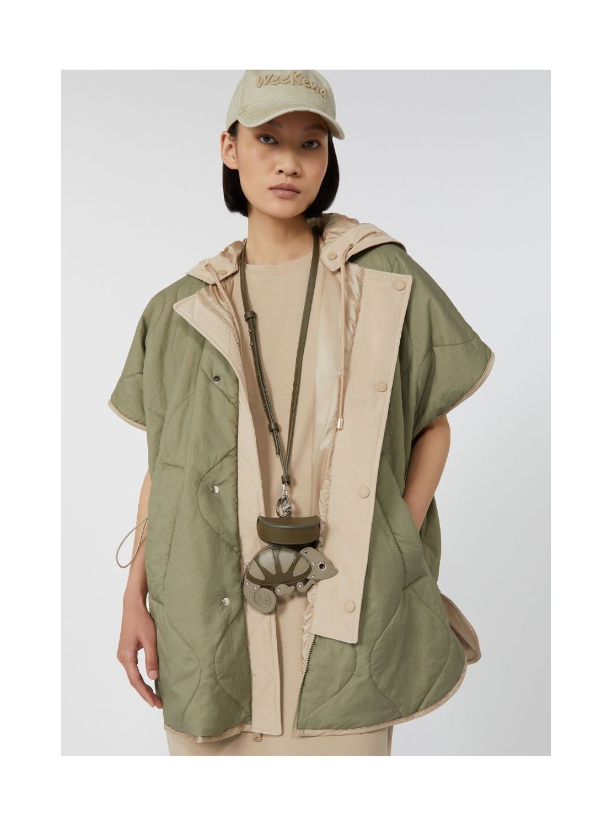 Eksklusiv cape i vandafvisende canvas med Luxepad-isolering i kamel-silke-blanding. Designet med rund hals, aftagelig hætte med snøre, korte kimonoærmer og løbegang i taljen. Har skjult lynlås og trykknapper foran, paspolerede lommer i siderne samt trykknap-slids i siden. Indvendigt prydet med Weekend Max Mara-logo. Kan vendes for anden farve.Materiale: 100% polyester | Vattering: 49% polyester, 46% kameluld, 5% silke | Inderstof: 100% polyamid | Øverste indvendige del: 100% bomuld