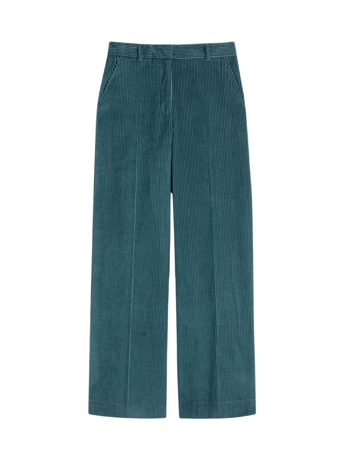 Lange bukser i blød fløjlsstruktur og karakteristisk bred ben-silhuet. Designet med bred linning, lynlås og lille krog, skrå sidelommer, paspolerede baglommer, bæltestropper og pressefolder for et klassisk udtryk.Materiale: 100% Bomuld
