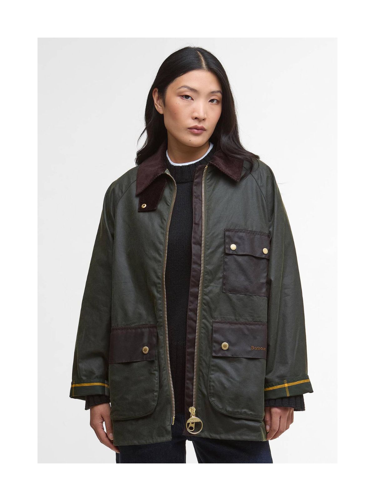 Inspireret af Solway-jakken fra 1960 giver denne voksjakke et moderne twist på en klassisk bestseller-silhuet. Jakken er detaljeret med en oversized fløjlskrave, forstørret ringlynlås og tre lommer, mens kontrasterende guldtonede håndvarmerlommer giver et robust og stilfuldt finish.Materiale: 100% Bomuld (waxed) | Foring: 65% Polyester, 35% Bomuld