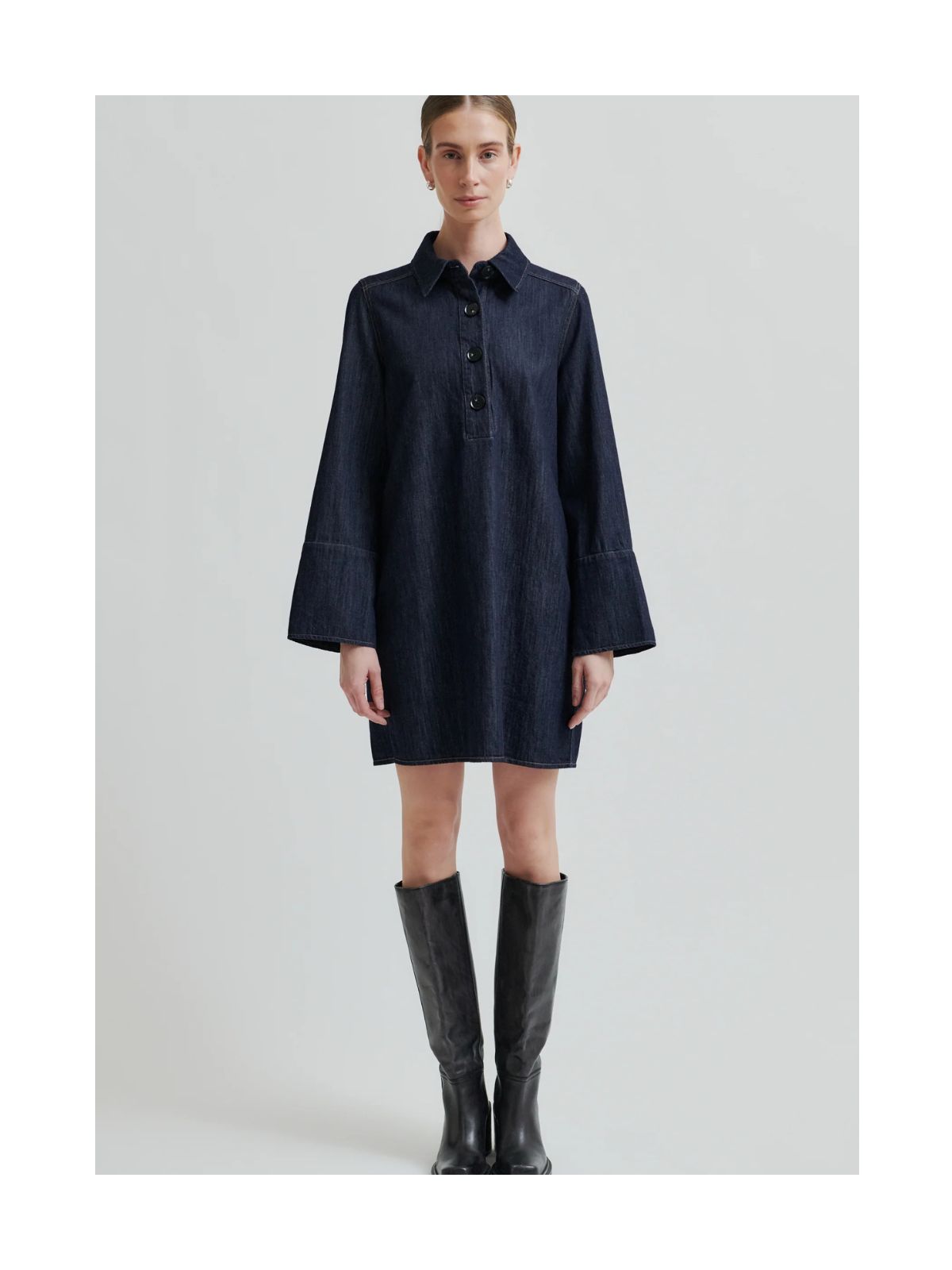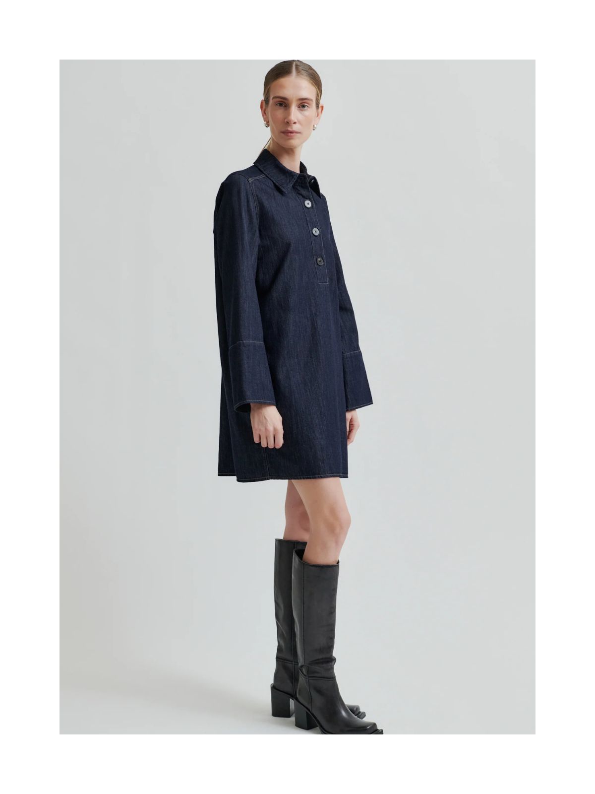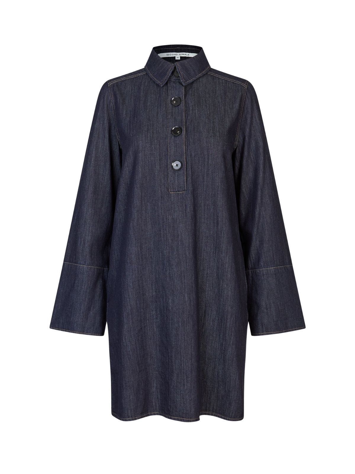 Smartdenimkjole fra SECOND FEMALE. Kjolen er i bomuldsdenim med mørkeblå vask og kontraststikninger i et lige loose fit design. Kjolen har krave og halv stolpelukning med knapper, lange ærmer med brede manchetter samt kjulte lommer i sidesømmene. Omvendt læg bagpå med knap- og stropdetalje.Længde: ca. 80 cm