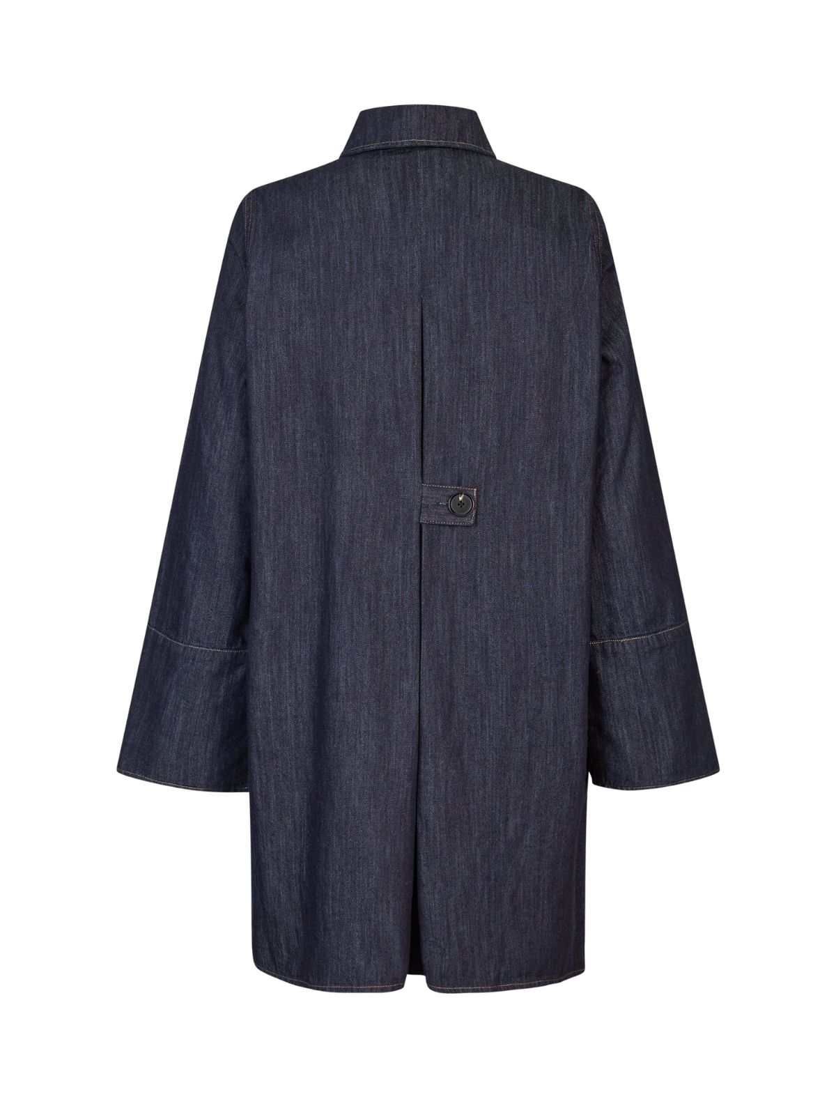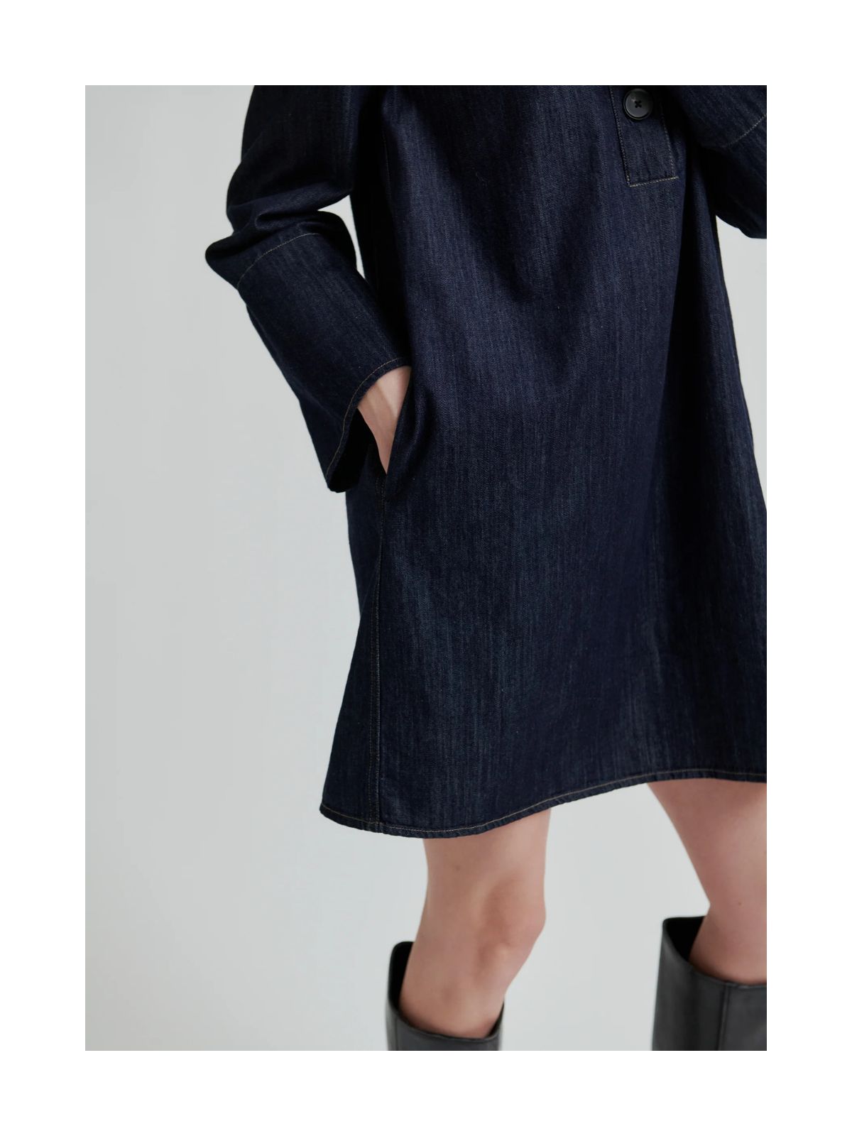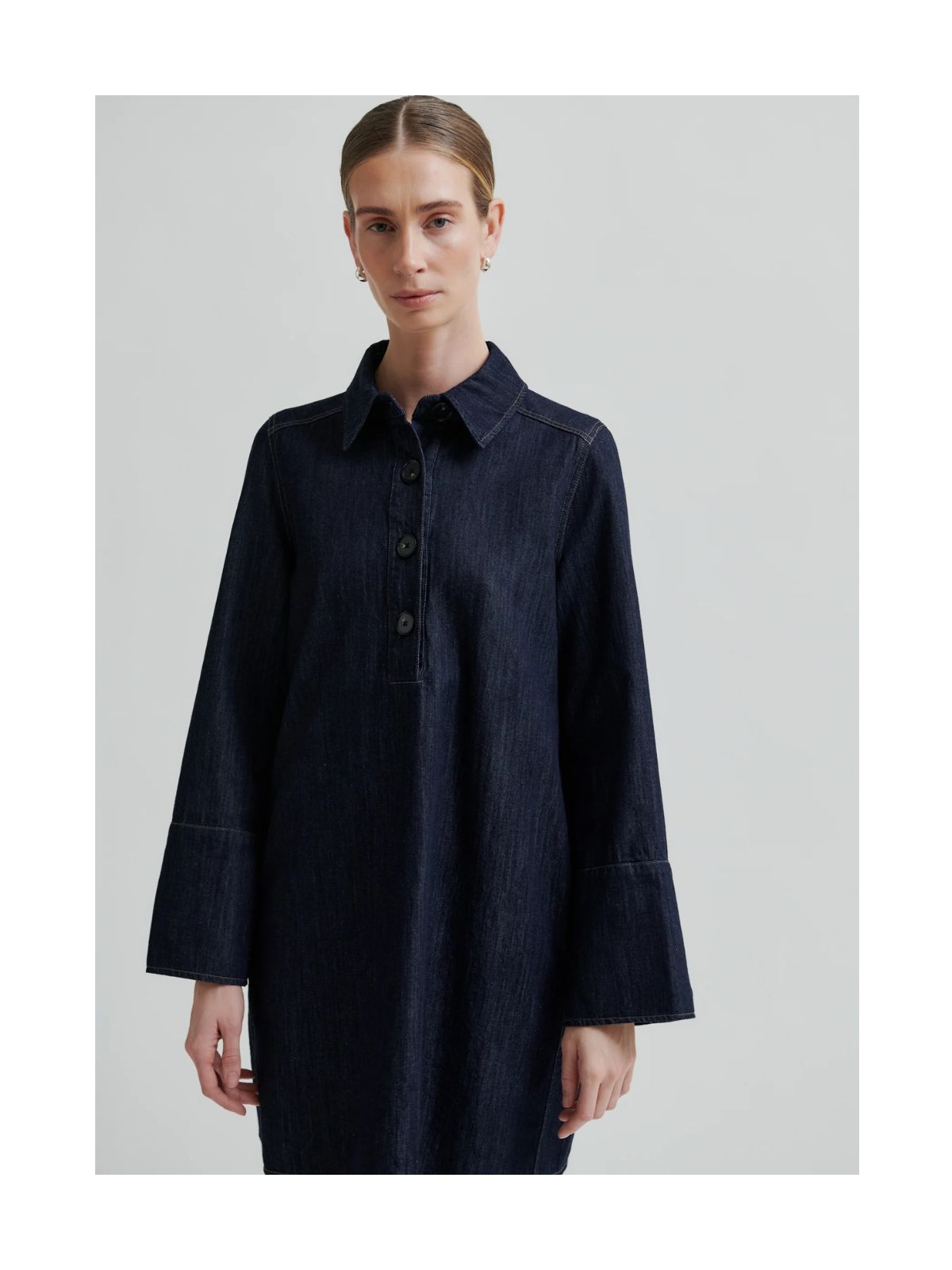 Smartdenimkjole fra SECOND FEMALE. Kjolen er i bomuldsdenim med mørkeblå vask og kontraststikninger i et lige loose fit design. Kjolen har krave og halv stolpelukning med knapper, lange ærmer med brede manchetter samt kjulte lommer i sidesømmene. Omvendt læg bagpå med knap- og stropdetalje.Længde: ca. 80 cm