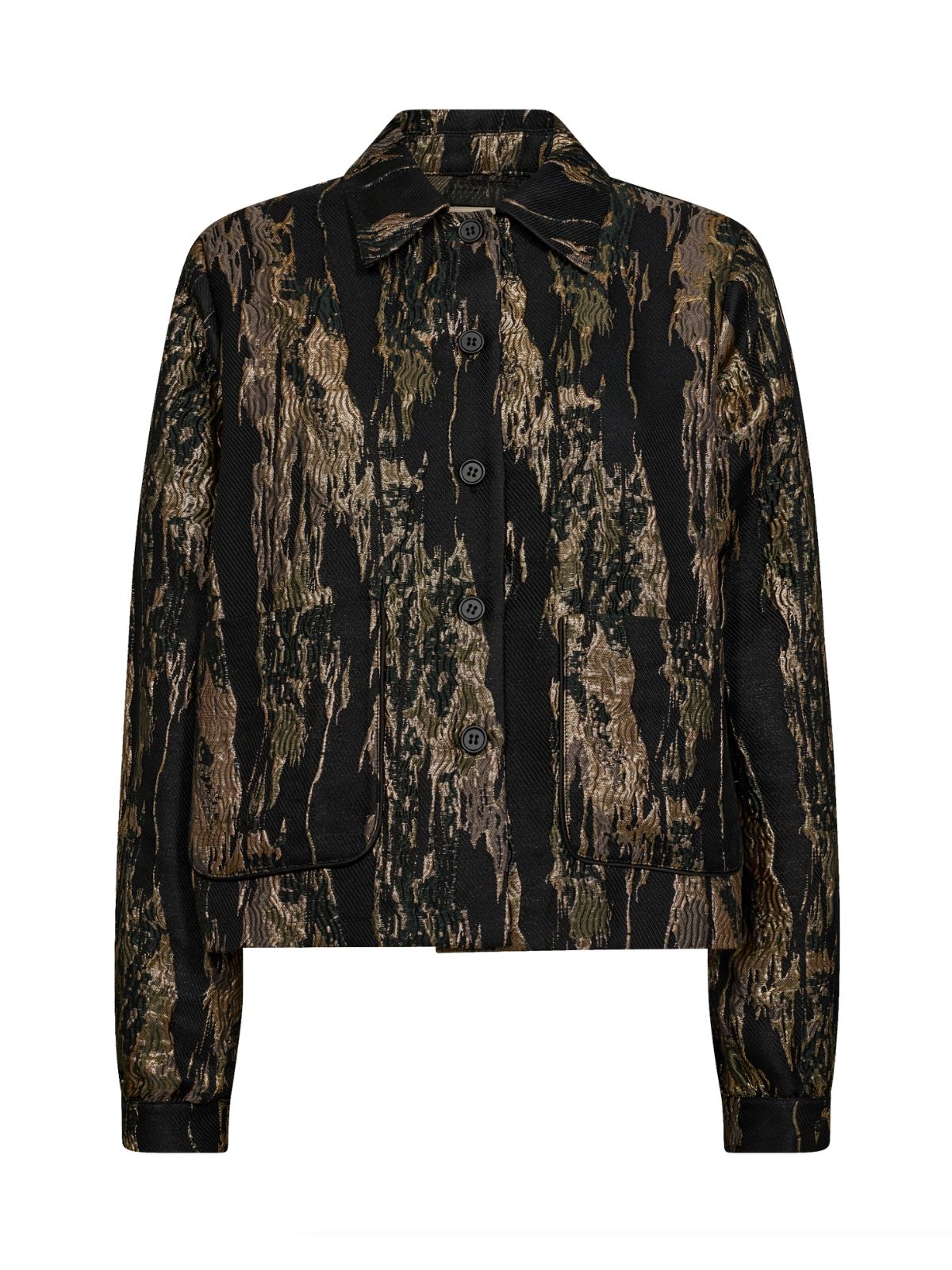 Denne stilfulde jakke har en klassisk krave og afslappet fit, der kombinerer komfort og sofistikation. Fremstillet i et tekstureret materiale med et glam camo-inspireret print, tilfører den et markant statement. Med knaplukning, praktiske lommer og manchetter med knapper er den et alsidigt valg, der løfter enhver garderobe.Materiale: 54% Genanvendt polyester, 29% Polyester, 15% Metal fibre, 2% Polyamid