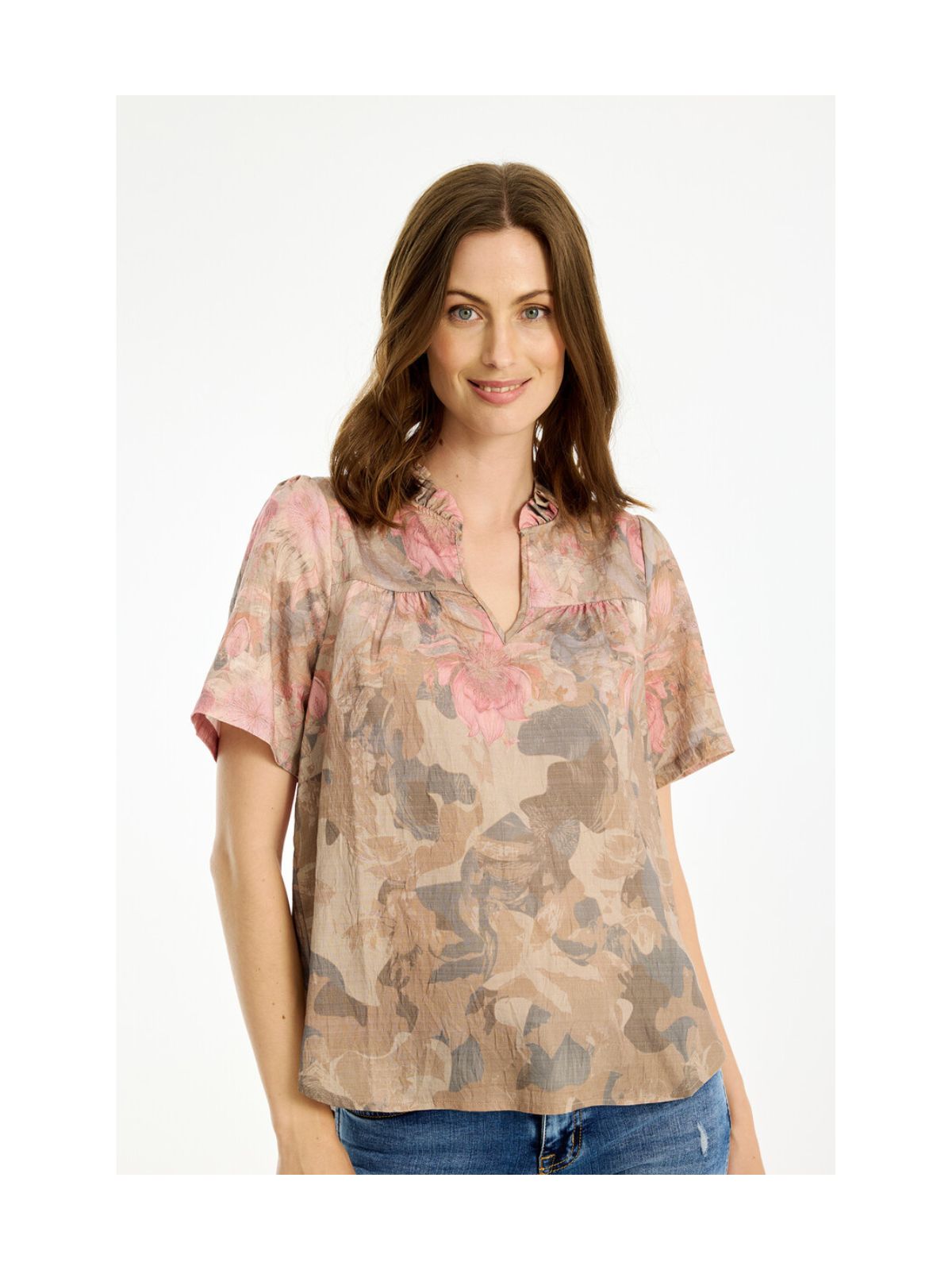 Smuk t-shirt i det fineste print fra In Front. T-shirten har en V-udkæring, flæsekant ved kraven, korte luftige ærmer og en afslappet pasform.Pasform: Afslappet pasform