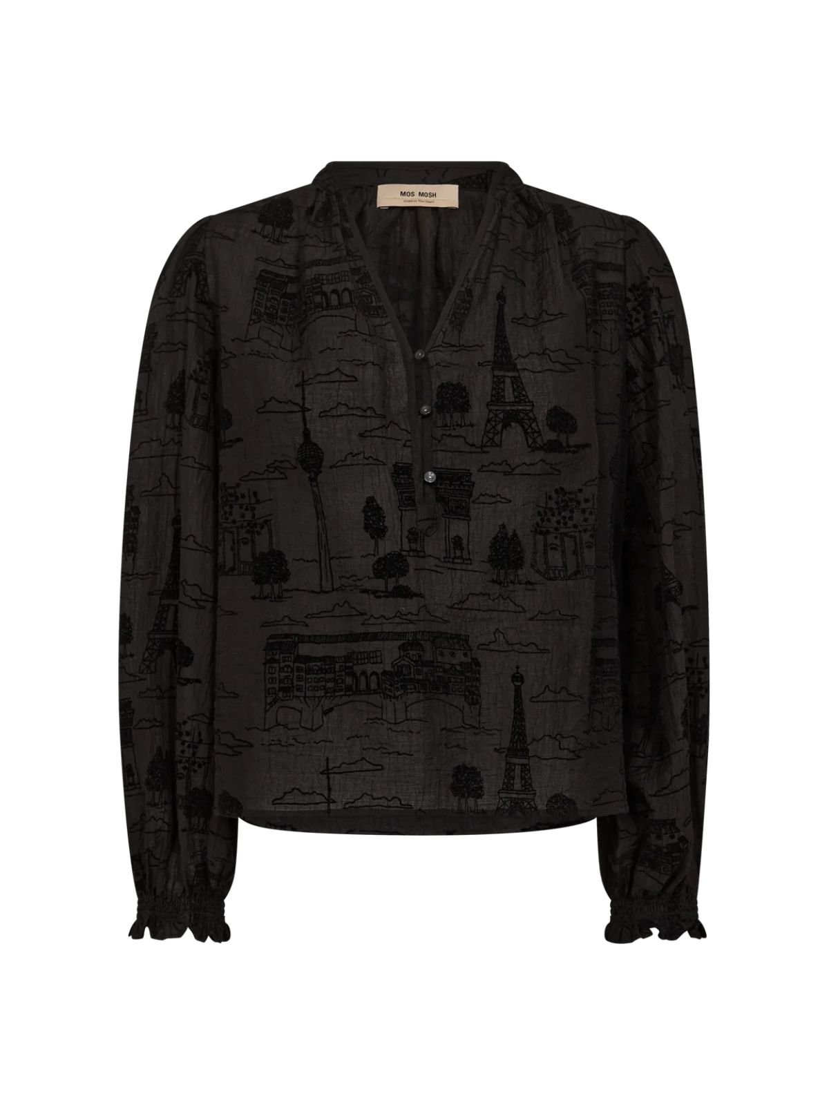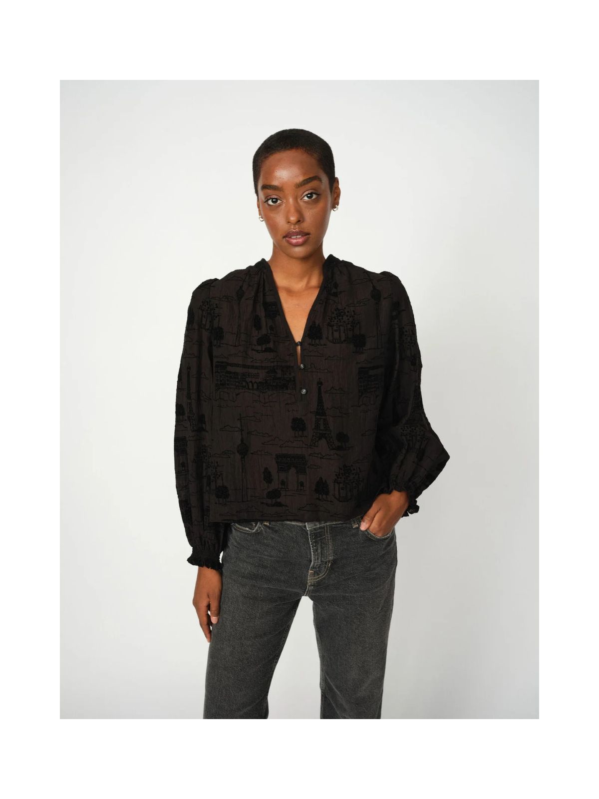 Bluse med håndtegnet mønster af ikoniske seværdigheder. Afslappet silhuet med halvknappet stolpelukning, voluminøse ærmer og smockmanchetter. Perfekt med jeans til et poleret hverdagslook.Materiale: 70% Lyocell, 30% Polyamid, 20% Polyester