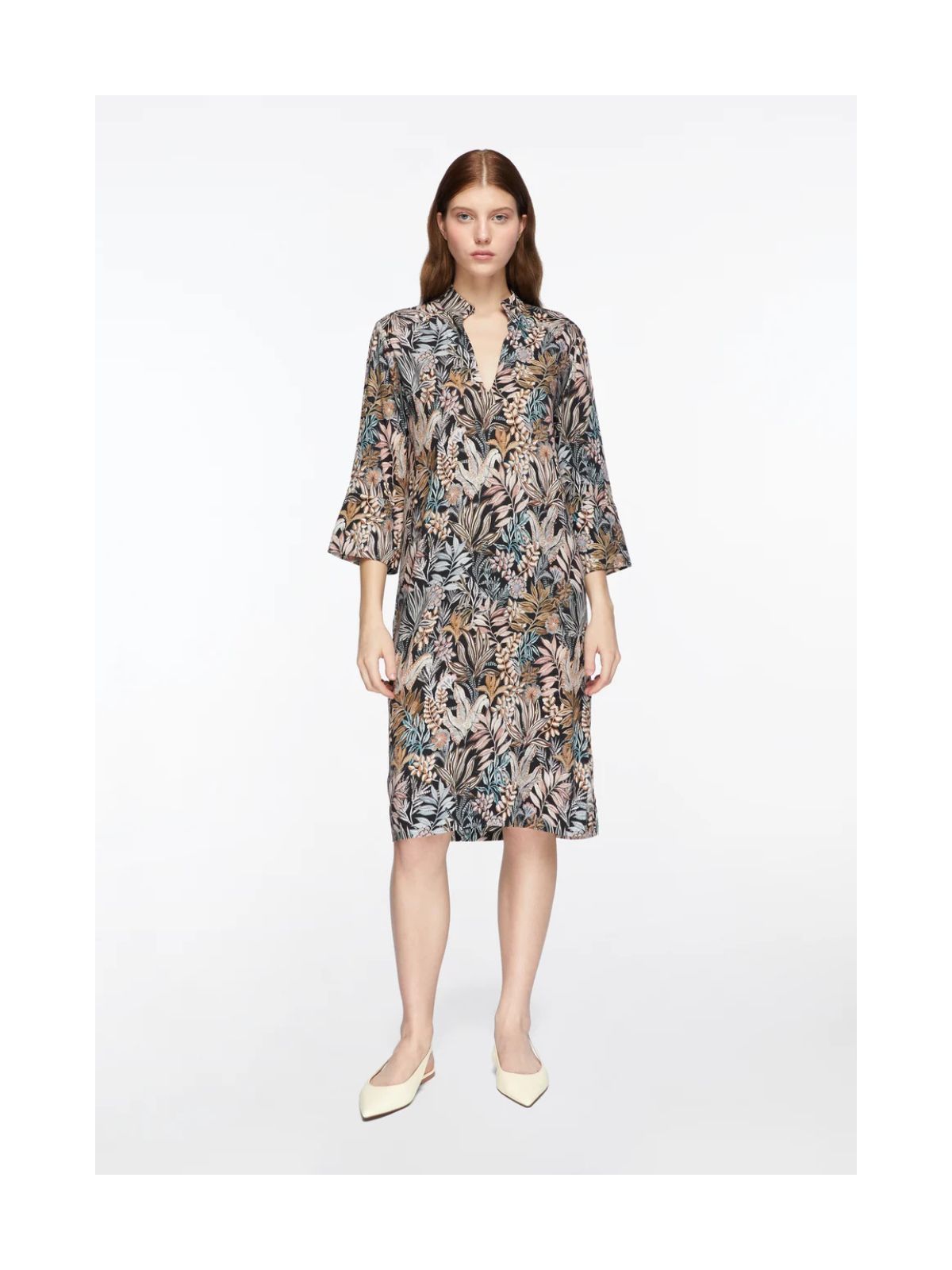 Denne skjortekjole har en afslappet silhuet med knaplukning foran og albuelange ærmer, der sikrer både komfort og ubesværet stil. Det allover-print giver et subtilt visuelt twist, hvilket gør kjolen alsidig til både hverdag og mere formelle lejligheder.