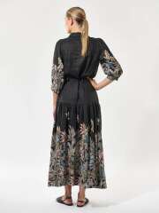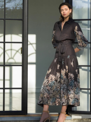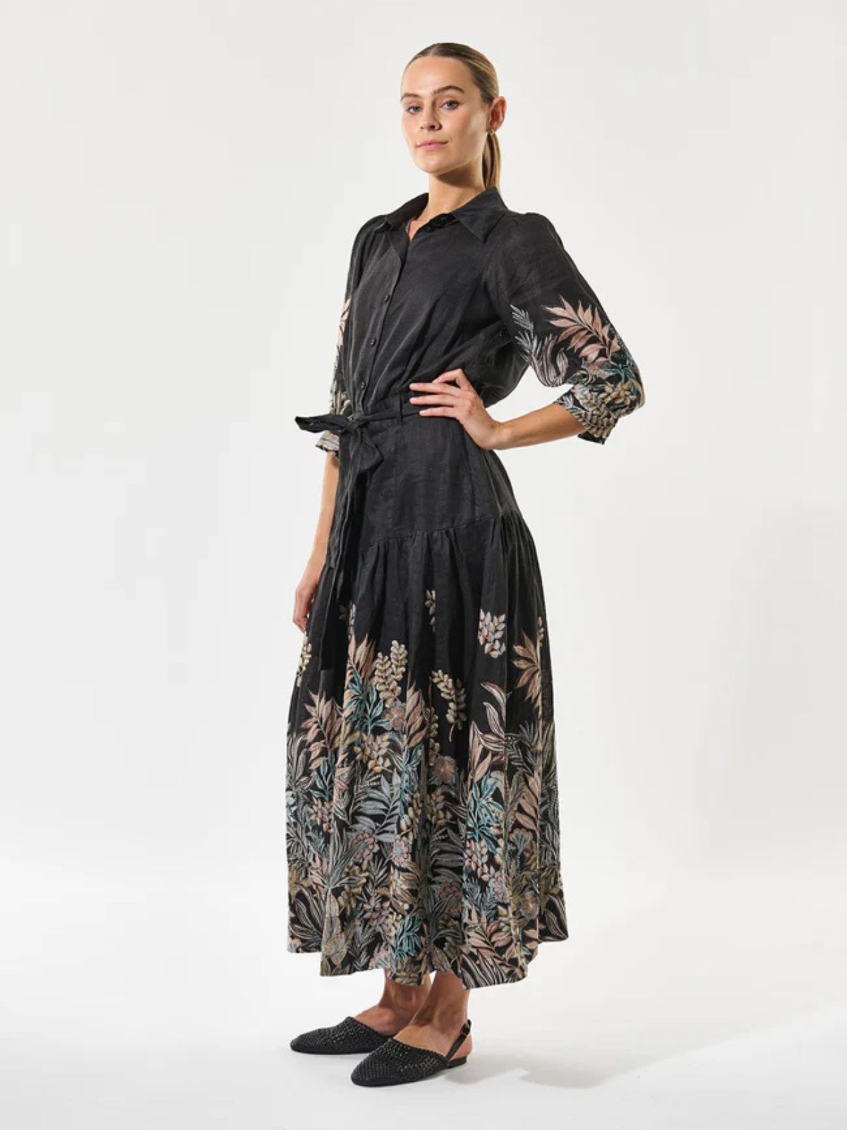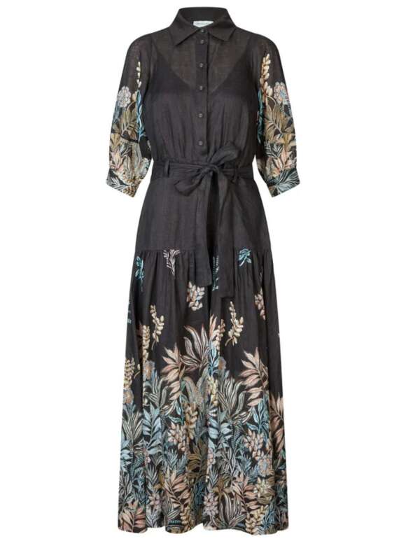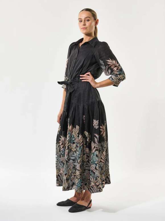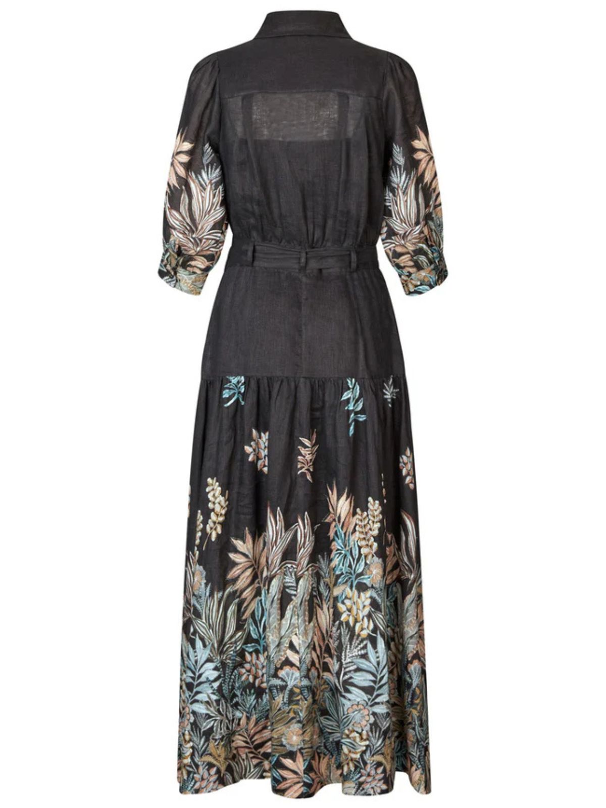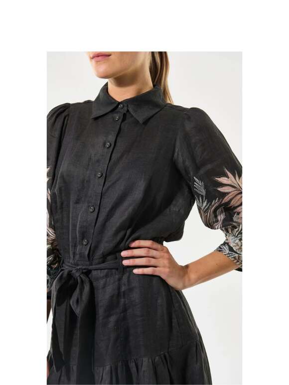 Raffineret lang hør kjole fra Dea Kudibal med eksotiske blomster fra kanten og på de lange, printede 3/4 ærmer. En tætsiddende top med pæn skjortekrave og halv stolpelukning åbner i en bredere nederdel under taljen, der er defineret af et bindebælte i samme stof. Kjolen lukkes med en lynlås i siden.Længde: 145 cm - Målt i str. M