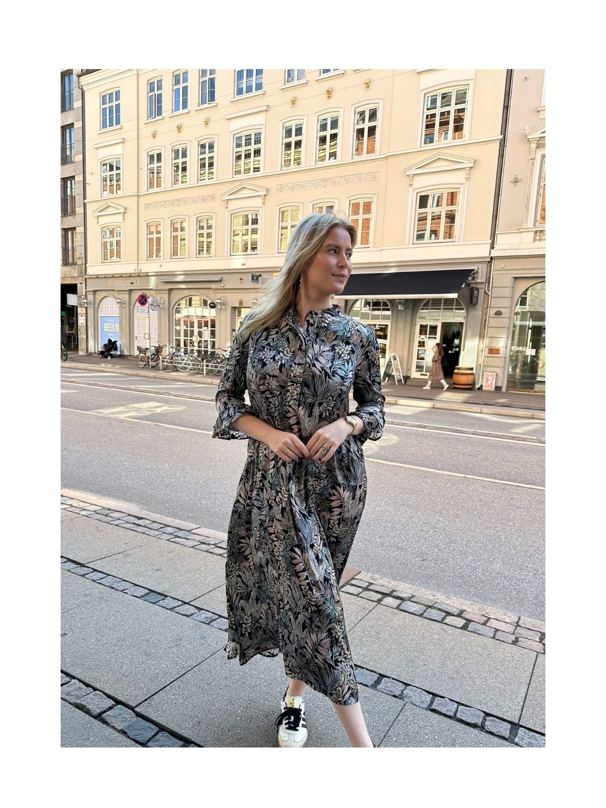 Smuk silkekjole fra Dea Kudibal med mønster. Kjolen har 3/4 lange ærmer med dobbeltflæse i bunden, rund halsudskæring med lav krave, knap panel på fronten og længde til midt på skinnebenet samt dobbelt flæsekant bagpå.Materiale: 92% Silke, 8% Elastan