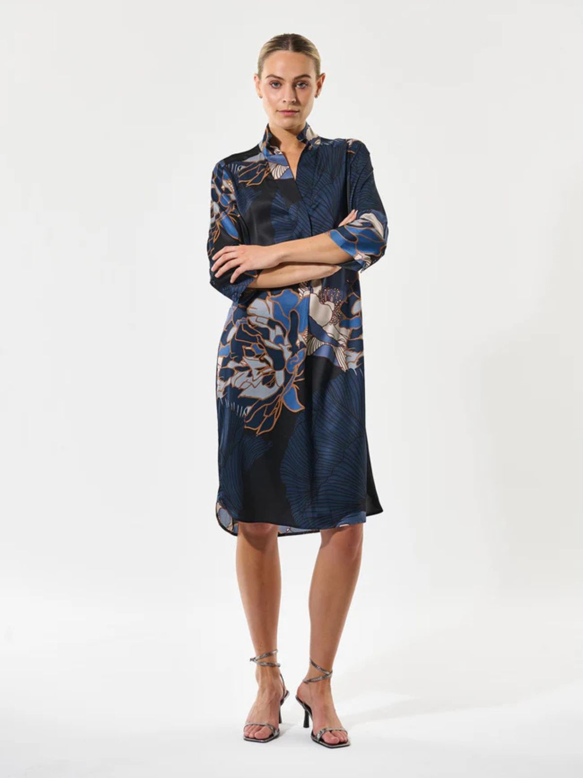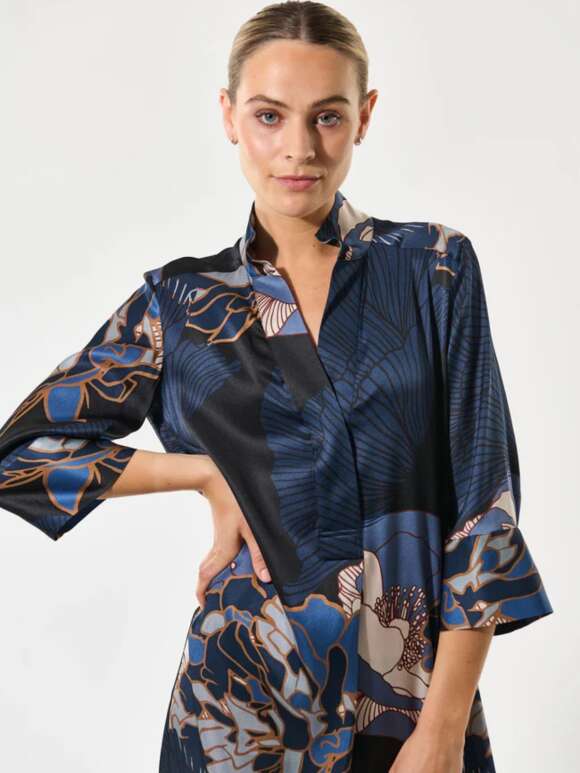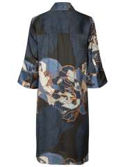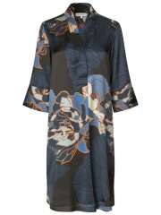 Sofistikeret skjortekjole fra DEA KUDIBAL. En af de mest elskede styles og perfekt til alle kropsformer. Kimono-udskæringen og kraven giver den elegance, mens de dybe ærmer med knapper foran har en afslappet attitude. Denne elegante model kommer i et dristigt oversized print af japanske kameliaer på stretch silke twill.Længde: 104 cm - Målt 'i str. M
