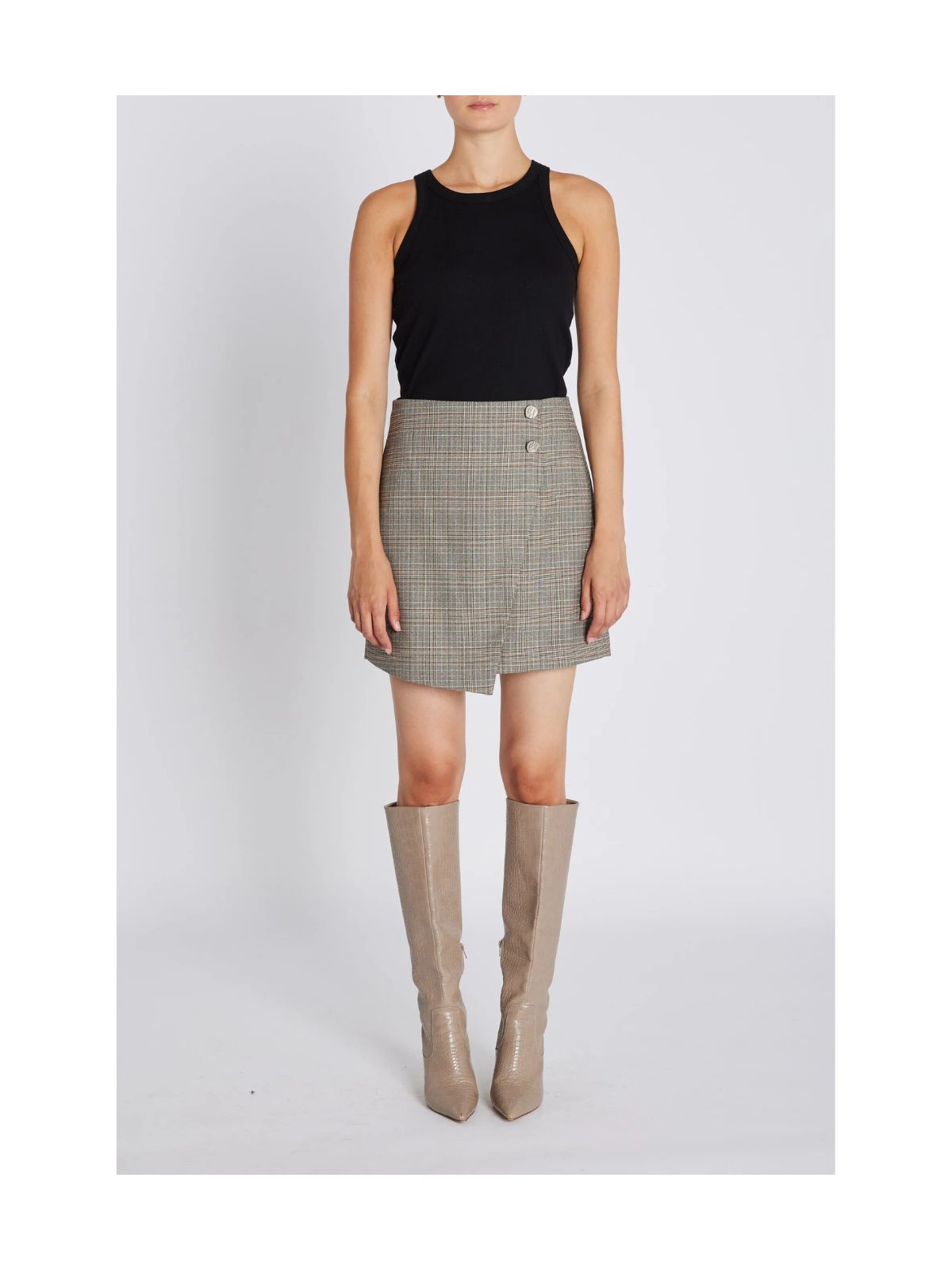 Asymmetrisk nederdel fra Bruuns Bazaar. Nederdelen har to pynte knapper på fronten, ternet print og skjult lynlåslukning bagpå. Styles den med et par støvler og en turtleneck for et smart look.Materiale: 65% Polyester, 33% Viskose, 2% Elastan