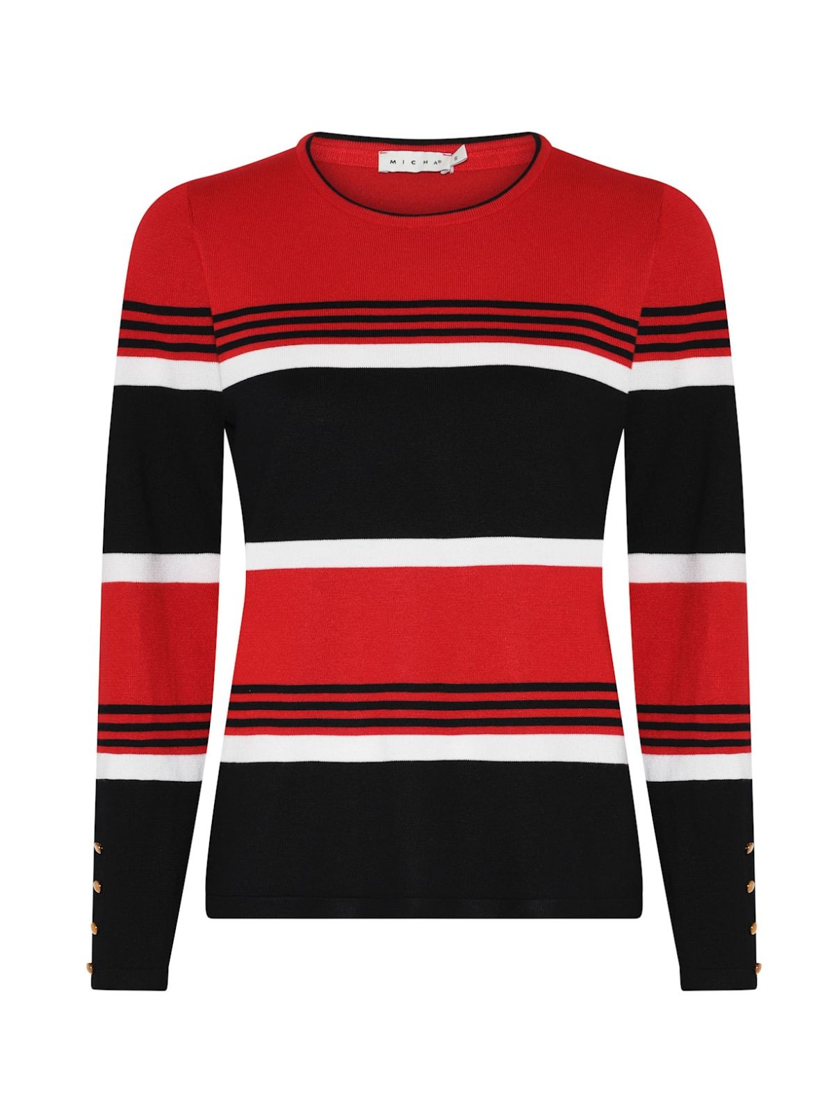 Skøn stribet strik fra Micha. Blusen har et regulært fit med vandrette striber, en rund halsudskæring og lange ærmer med dekorative knapper.Materiale: 70% Viskose /EcoVero), 30% Polyester