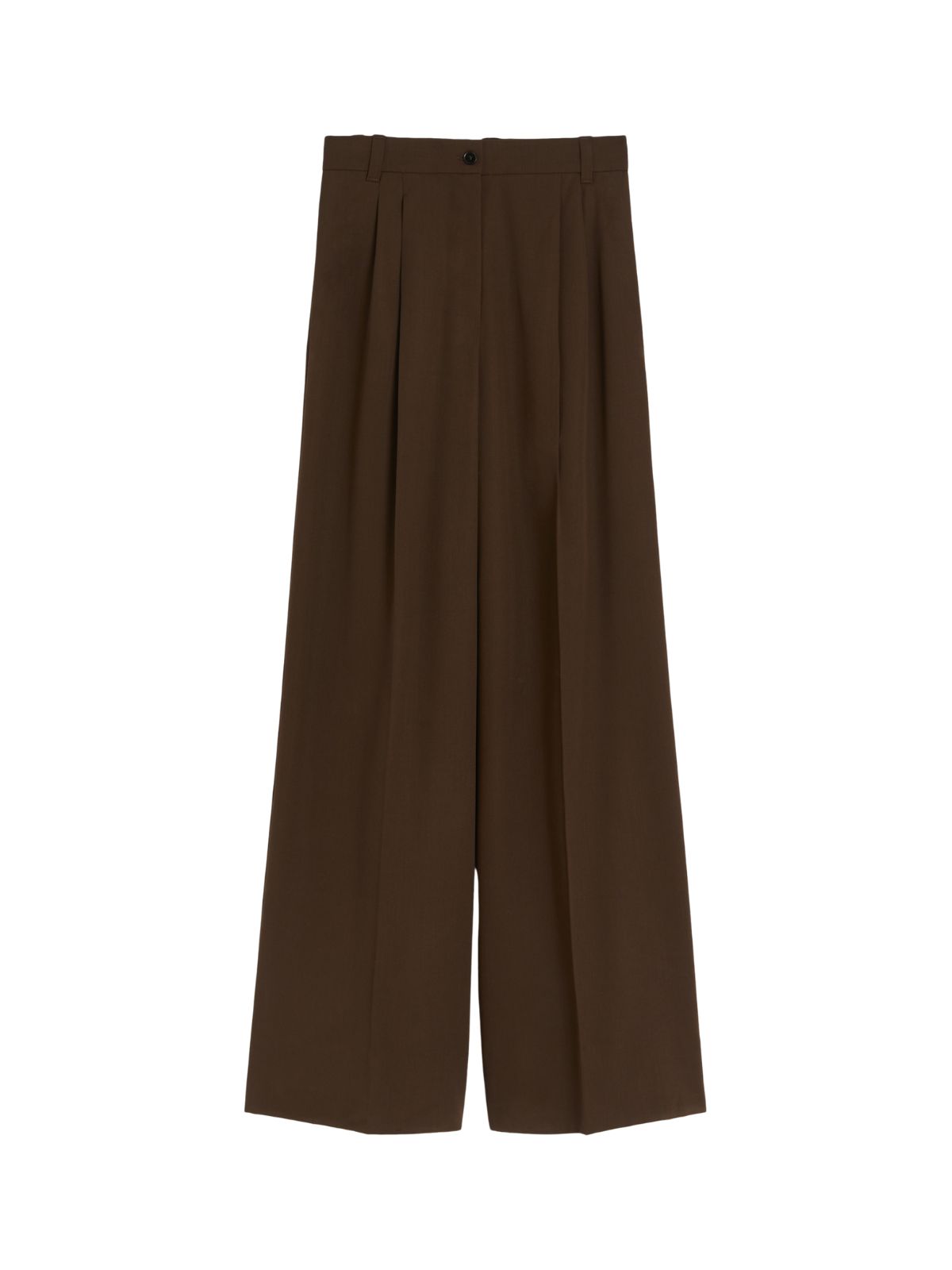 Bukser i ren uld twill med vide ben. Udført med bred linning, lynlås- og knaplukning, skrålommer i siderne samt bæltestropper og presset læg.