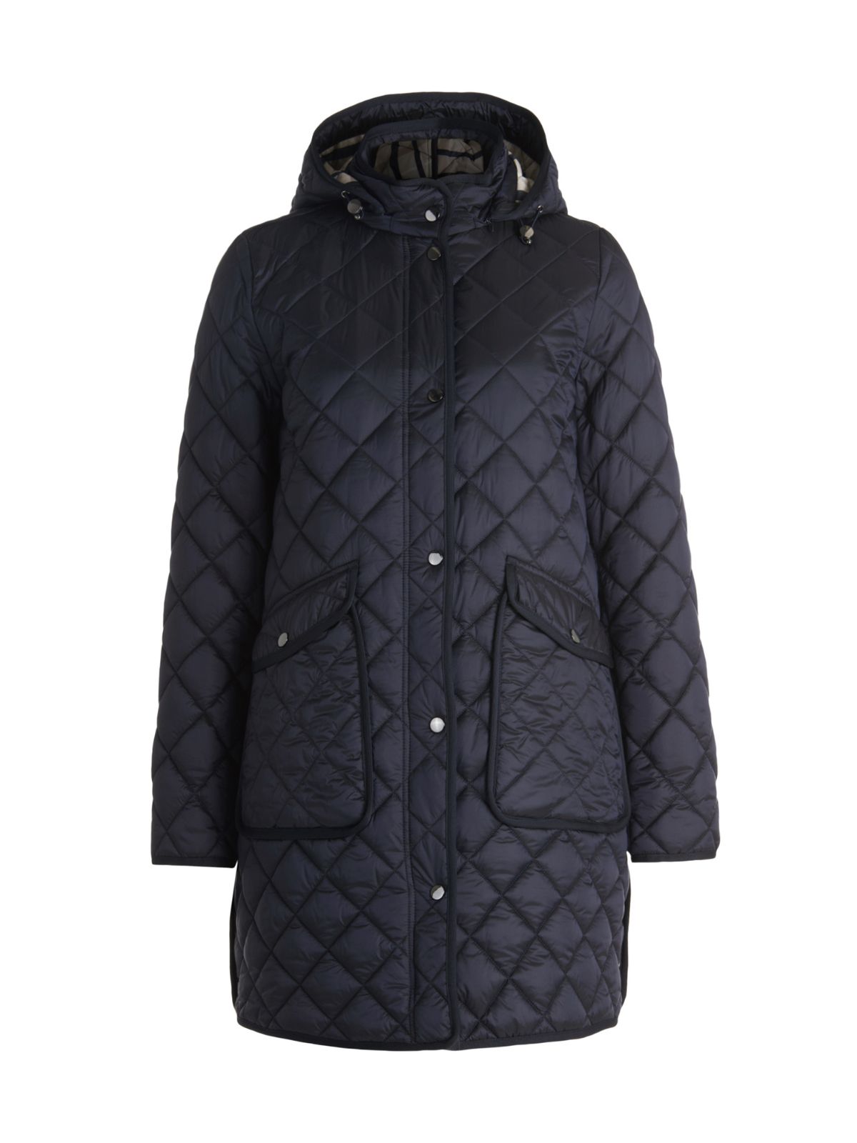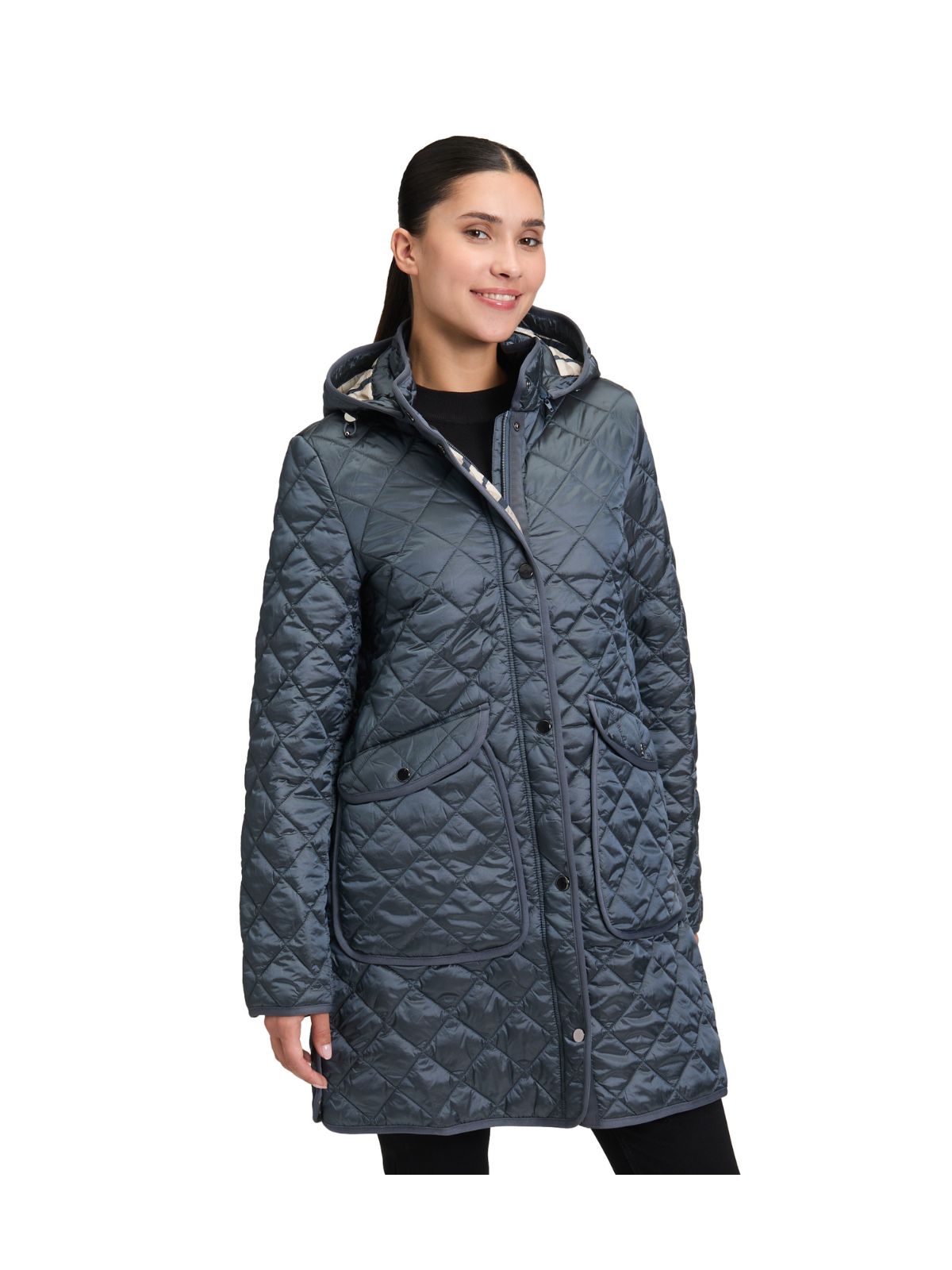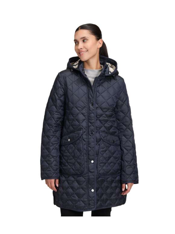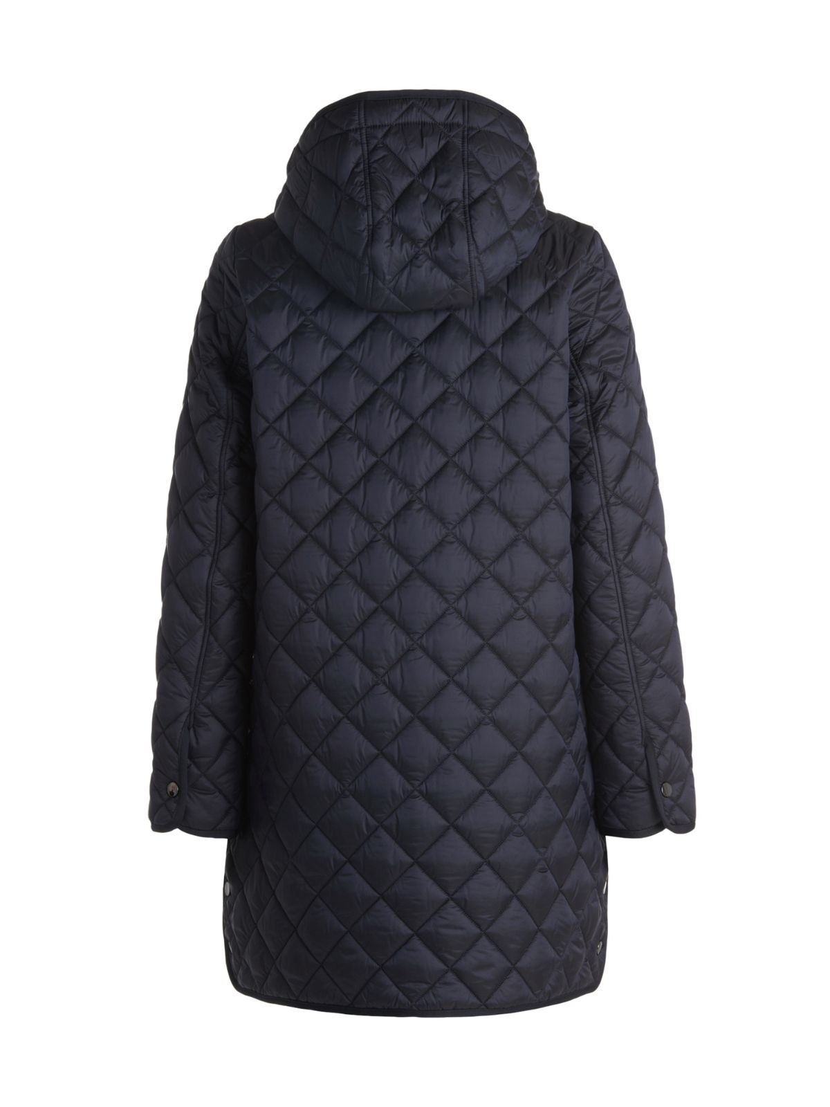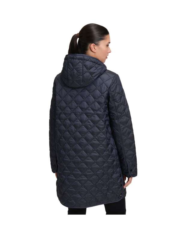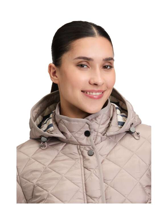 Smart quiltet 3/4 lang jakke fra Betty Barclay i sporty deisgn med aftagelig hætte. lynlås lukning samt ekstra vindfang med trykknapper. Jakken har påsatte lommer foran samt trykknap detalje i siderne for mere komfort.Længde: ca. 88 cm
