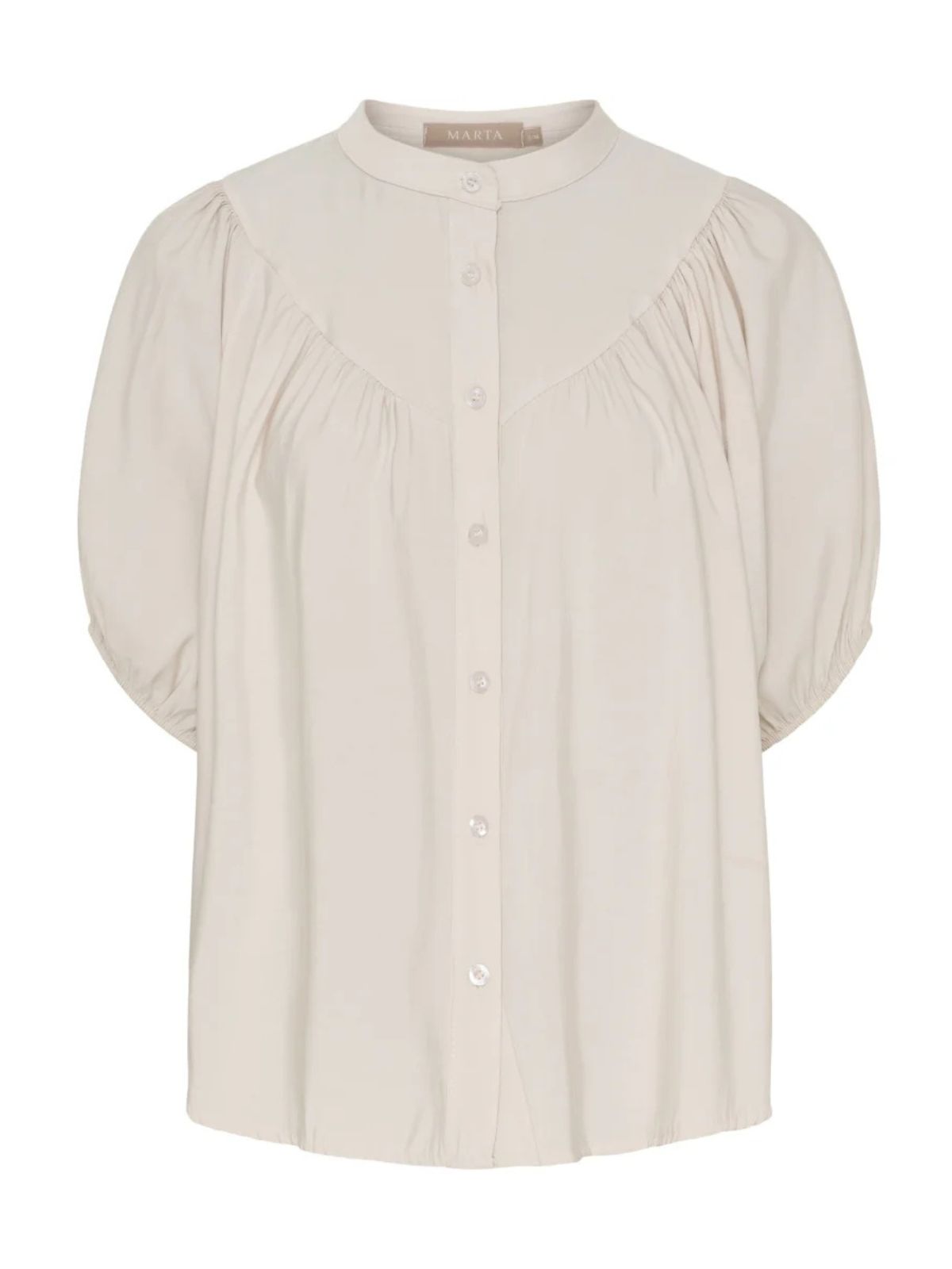 Sød og alsidig bluse fra Marta du Château med ballonærmer og fine rynkedetaljer. Blusen har kinakrave og gennemgående knapper, der giver et feminint og let udtryk. Perfekt til både hverdagsbrug og mere formelle lejligheder.