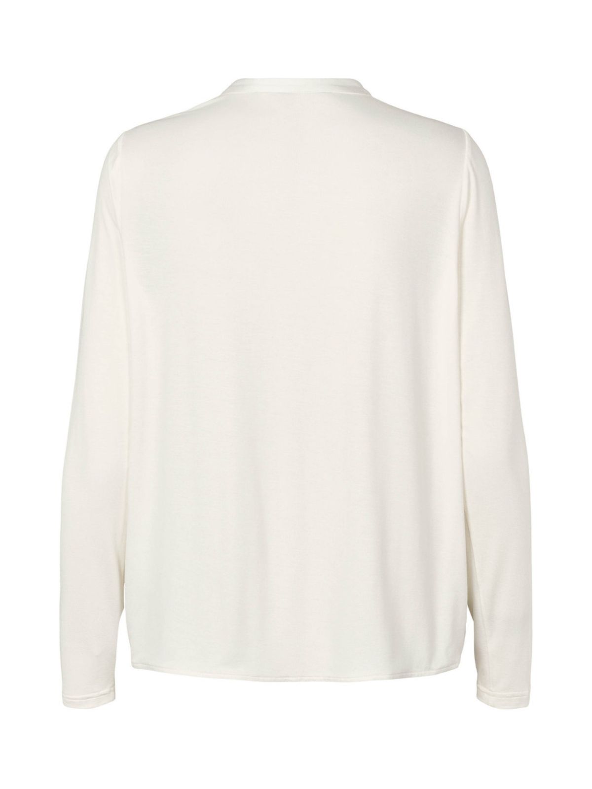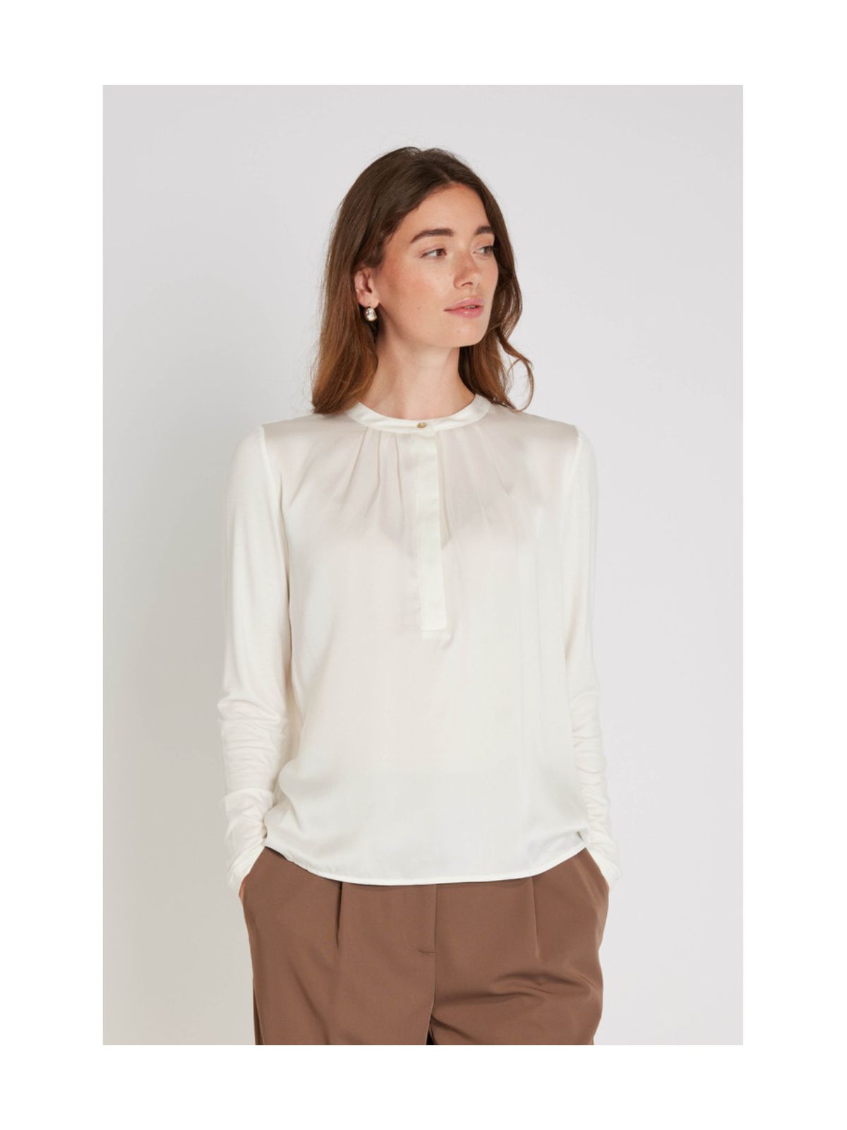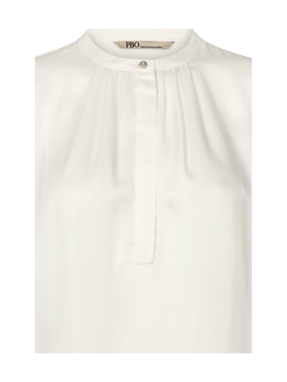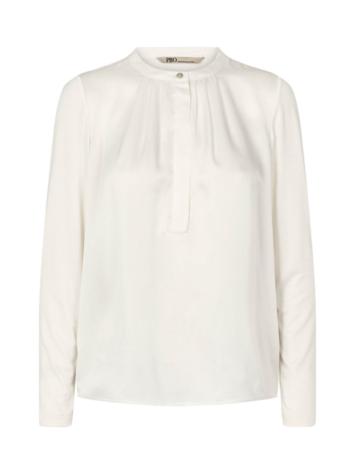 Smuk bluse fra PBO. Blusen har en rund halsudskæring med knap, skjulte knapper på fronten og en let feminin pasform.Materiale: 95% Viskose, 5% Elastan