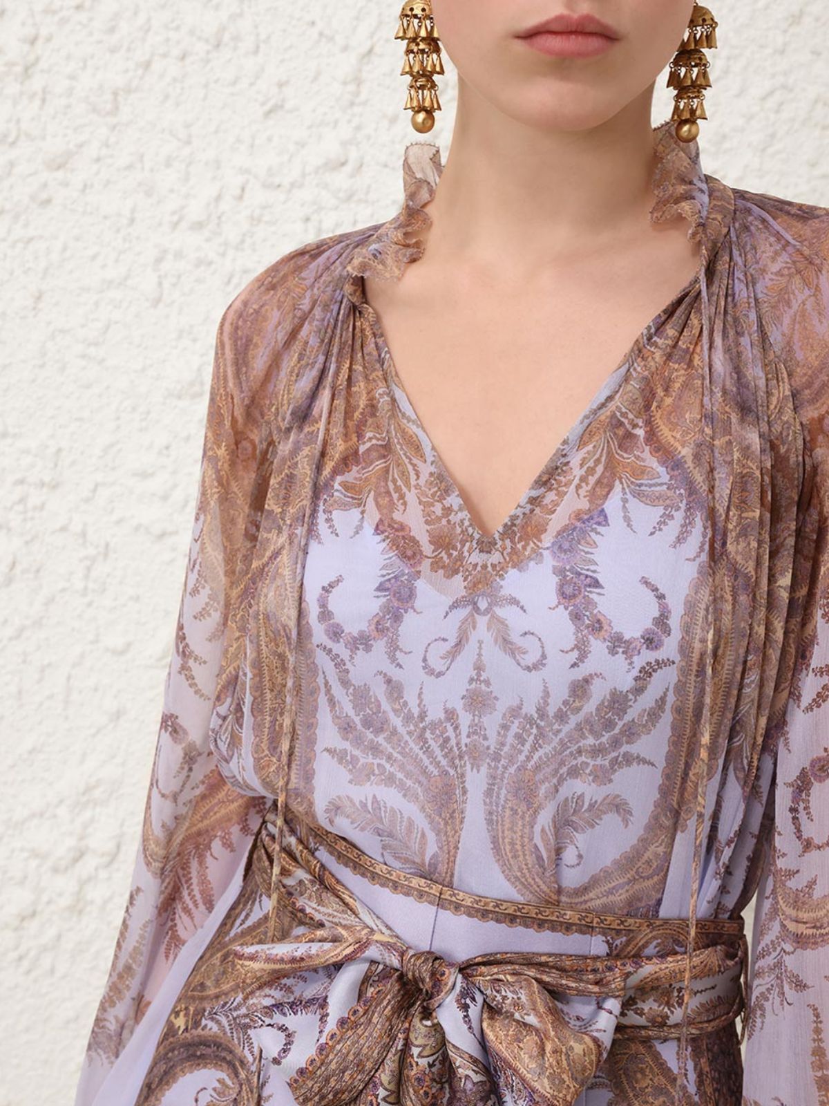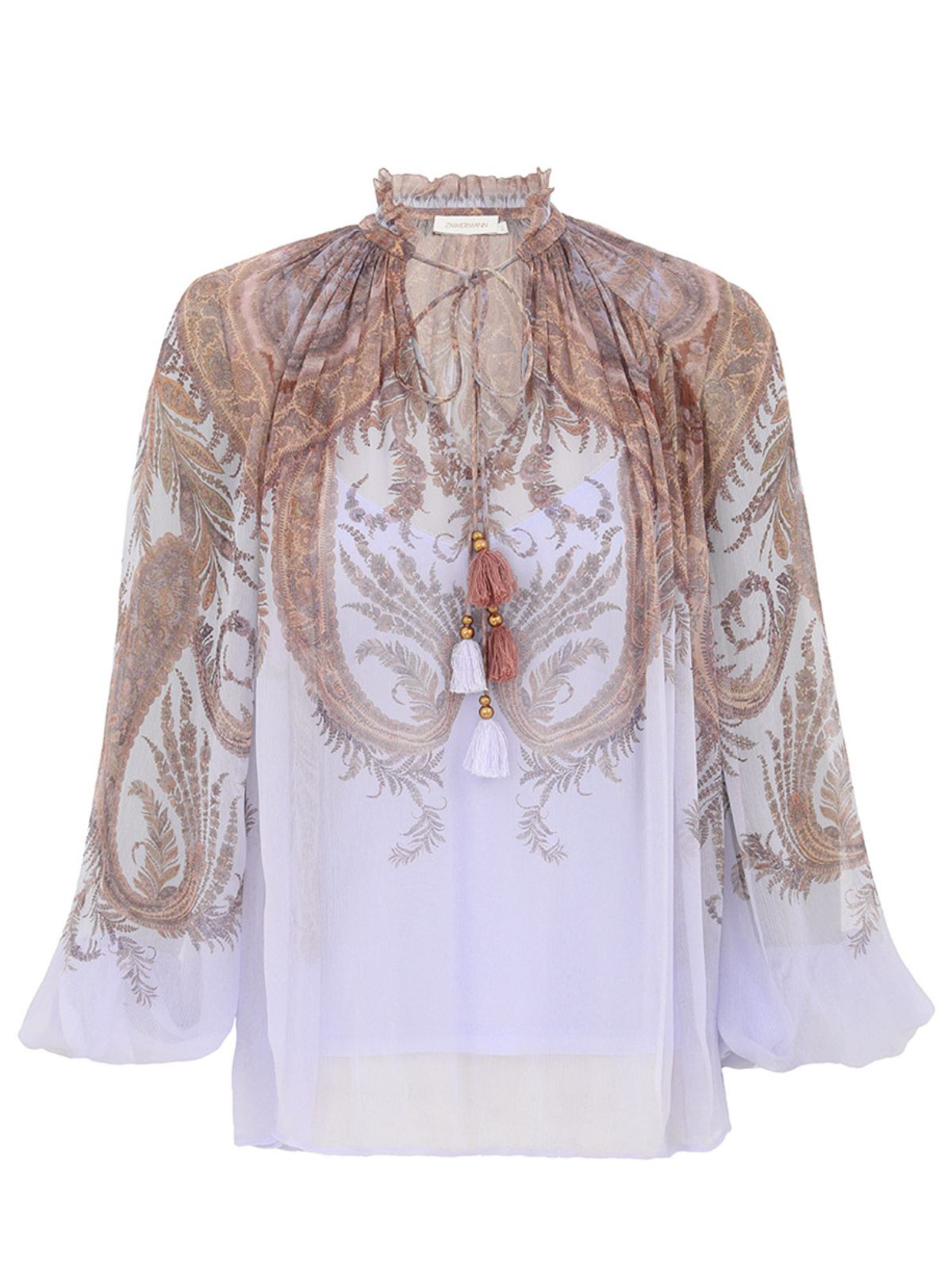 Sofistikeret Hypnotic Billow-bluse fra ZIMMERMANN i lilla paisley samt i florlet design. En langærmet bluse med V-udskæring, standkrave med lange dekorative bindebånd og draperinger. Blusen har flotte ballon ærmer med vidde og elastisk kant.Længde: ca. str. 1/ 38 - 64 cm / - 2/40 - 65 cm / - 3/42 - 65 cm