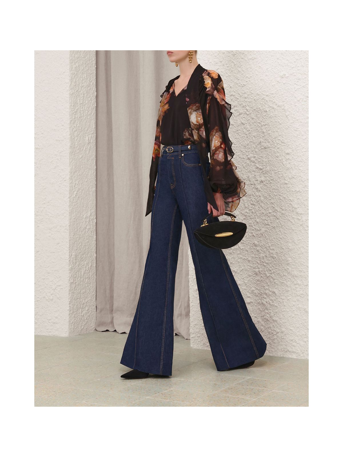 En sofistikeret bluse fra Zimmermann i sort med romantisk blomsterprint i varme nuancer. Blusen har bløde, flydende ærmer med lette flæser, samt en feminin sløjfedetalje i halsen, der giver et tidløst og elegant udtryk. Perfekt til at løfte ethvert outfit med et strejf af luksus og finesse.Materiale: 100% Viskose | Lining: 100% Viskose