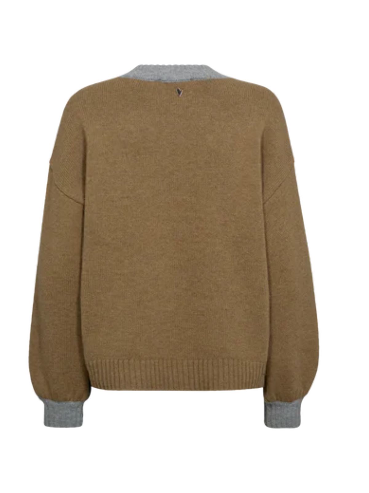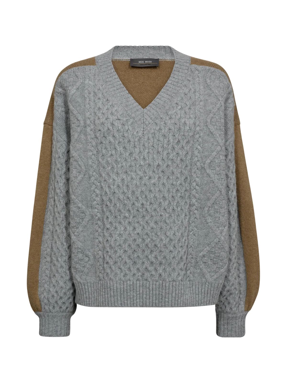 Elegant striktrøje fra MOS MOSH i en luksuriøs uld-alpaka-cashmere-blanding samt oversized pasform. Strikken er i tofarvet design kombineret med en struktureret kabelstrik foran med en glat, enkel strik bagpå, hvilket skaber en sofistikeret kontrast. Strikken har ribkanter ved V-hals, manchetter og kant fuldender designet så det balancerer komfort og stil perfekt.Længde: ca. ca. 70 cm