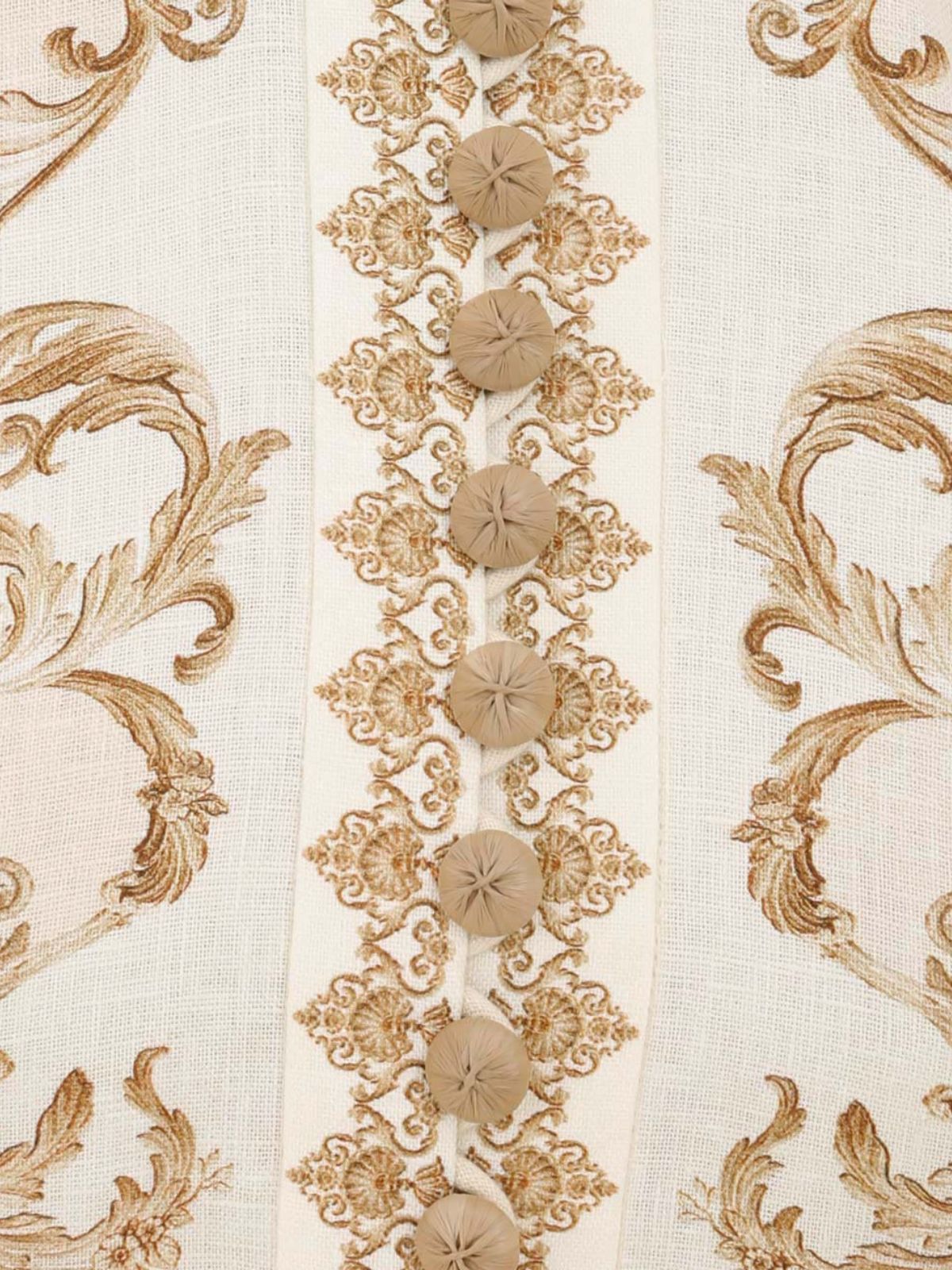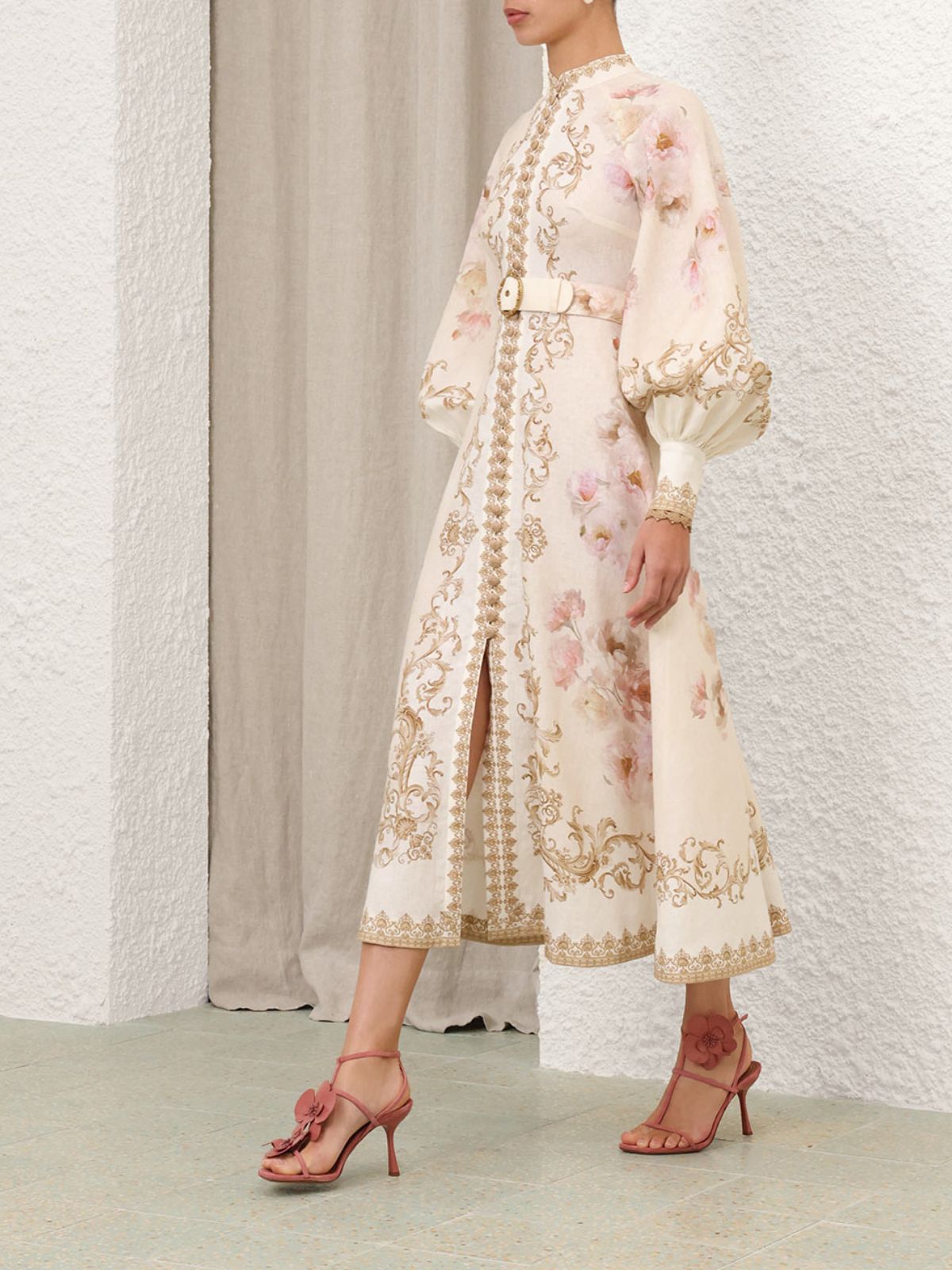 Exclusiv Hypnotic-midikjole fra ZIMMERMANN i raffineret design med knapper i cremefarvet peony. Midikjole i hør med lange blousonærmer med lynlåsmanchetter, raffiaknapper ned langs midten foran og et aftageligt, selvdækkende bælte.En elegant kjole til mange og særlige anledninger!