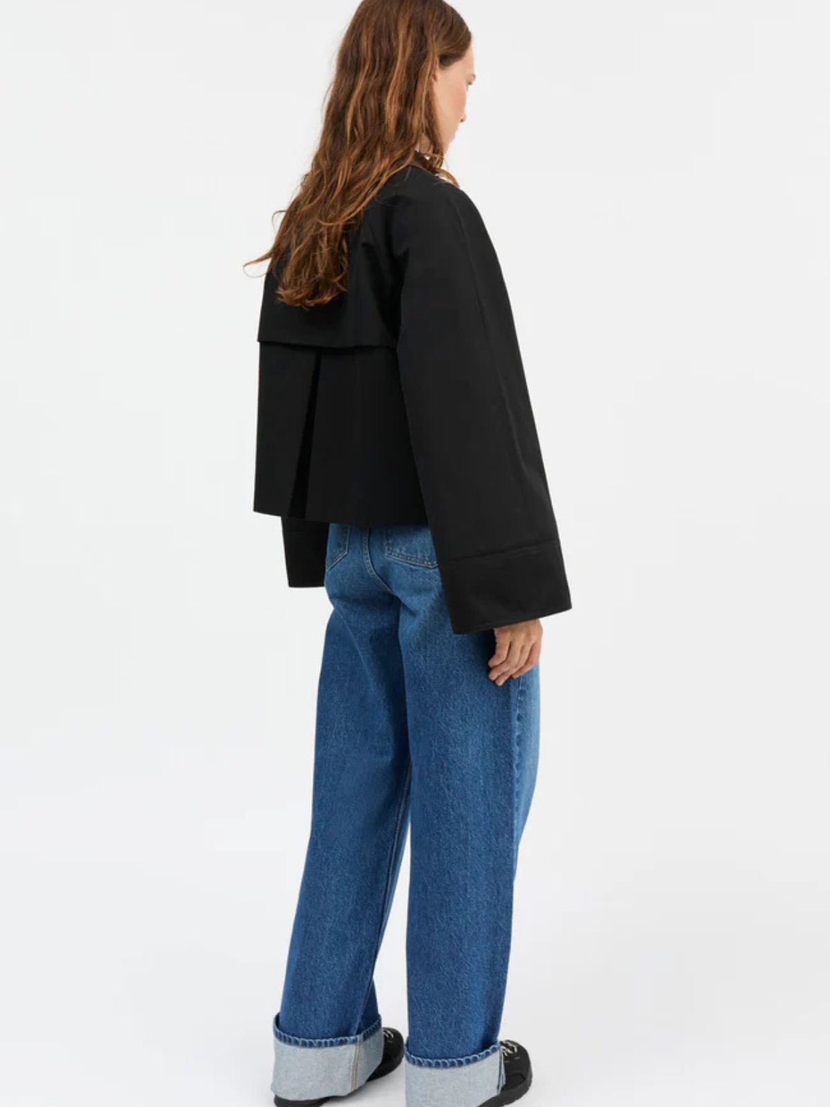Sofistikeret Gaby City Jacket fra SKALL i kort design med læg i ryggen samt i luksuriøs 100% økologisk bomuldskvalitet. Jakken har fløjlskrave og én synlig knap i halsen samt skjult knaplukning med stolpelukning og med lynlås. De brede raglanærmer har dybe opslag, der kan foldes op med en fløjlsbeklædt inderside. På fronten har jakken to rummelige klaplommer med åbning både fra toppen og siden, og derudover en brystlomme med både klap og paspoleret åbning.Pasform: Loose Fit / Normal Størrelse